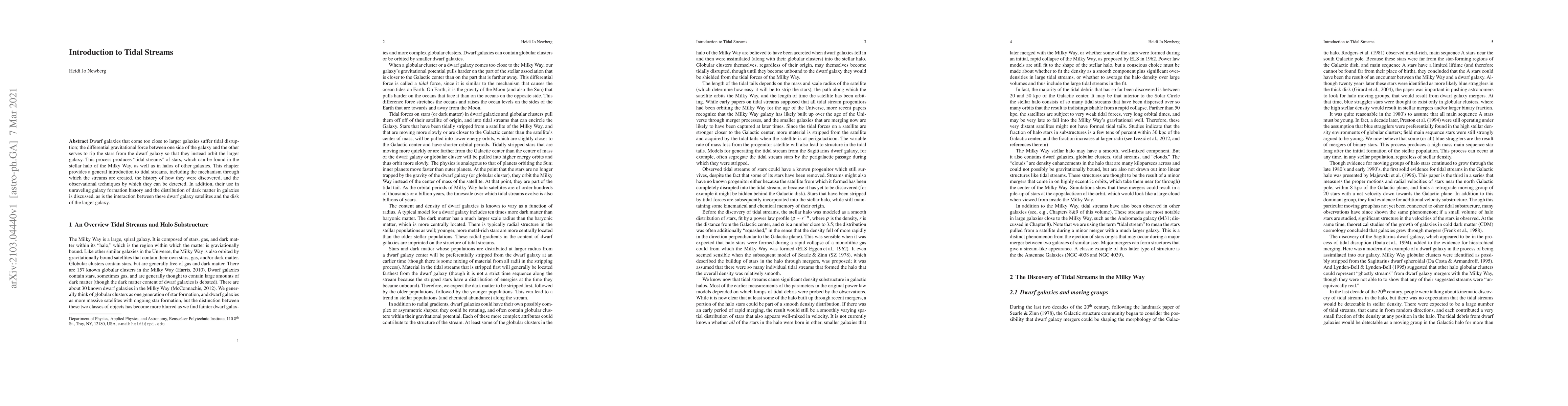 This paper introduces tidal streams, formed when dwarf galaxies are disrupted by larger galaxies, creating streams of stars that orbit the larger galaxy. It discusses the discovery, detection methods, and significance of tidal streams in understanding galaxy formation and dark matter distribution.