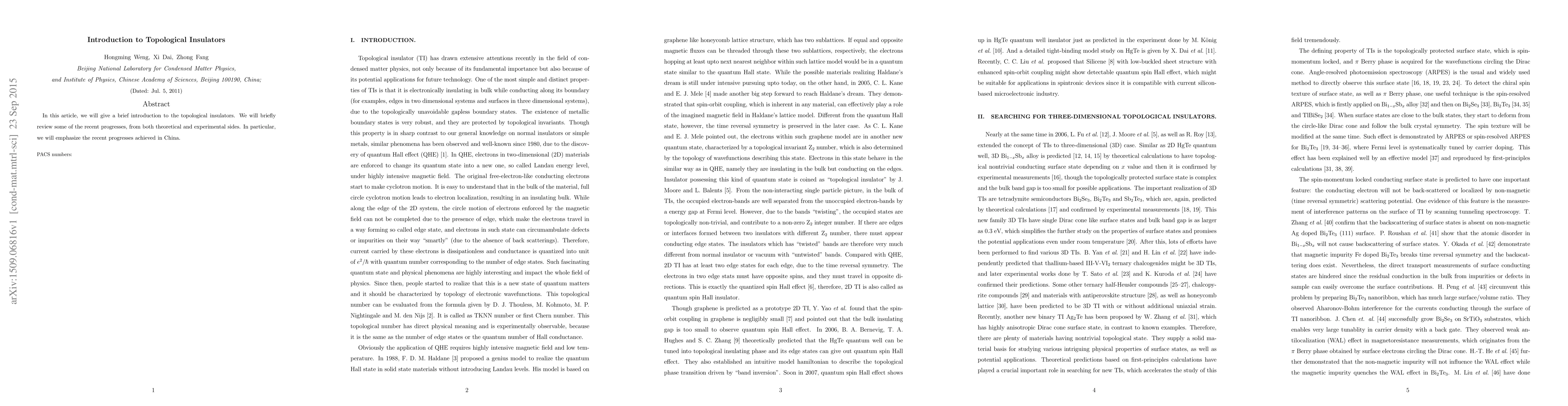 In this article, we will give a brief introduction to the topological insulators. We will briefly review some of the recent progresses, from both theoretical and experimental sides. In particular, we will emphasize the recent progresses achieved in China.