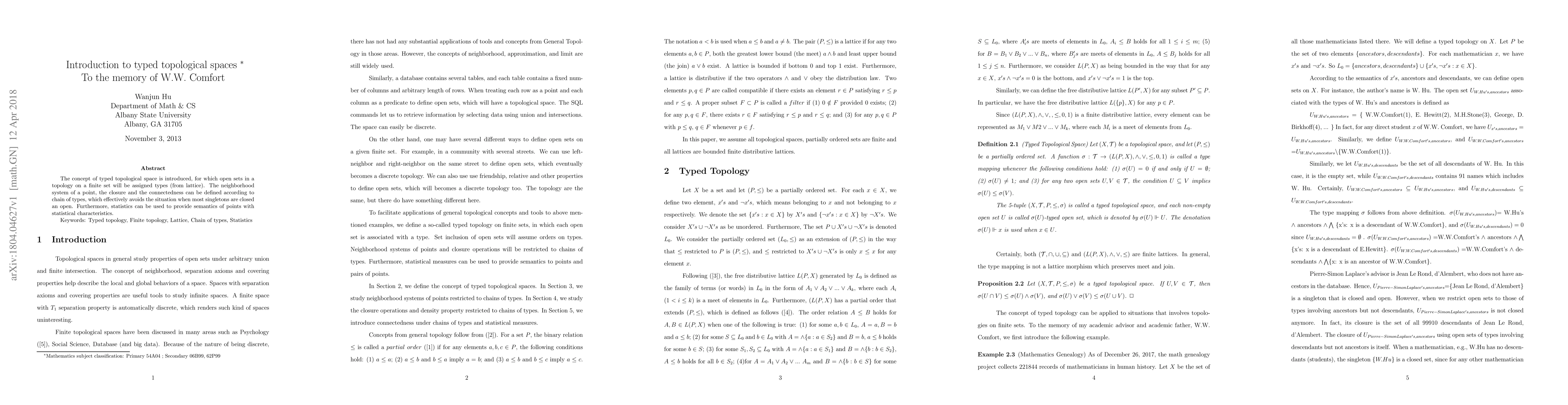 This paper introduces the concept of 'typed topological space', assigning types from a lattice to open sets in a topology on a finite set. It defines neighborhood systems, closure, and connectedness via type chains, preventing most singletons from being both open and closed. The approach also allows for points' statistical semantics using statistics.