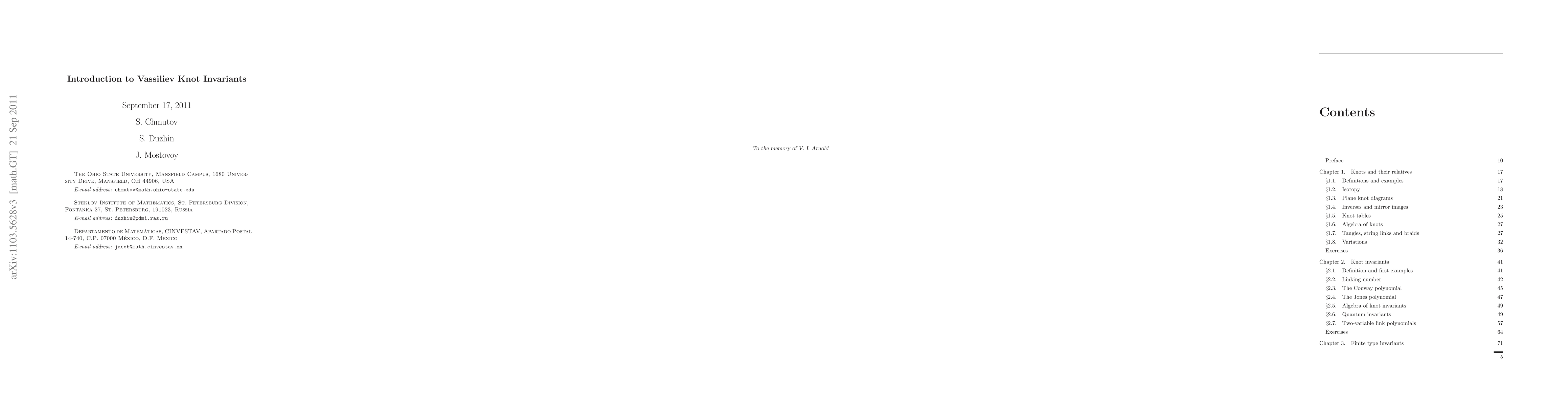 This book provides an accessible introduction to Vassiliev knot invariants, focusing on their combinatorial aspects and using visual examples for clarity. It aims to serve both beginners and advanced readers, with detailed explanations and occasional references to original papers for technical details.