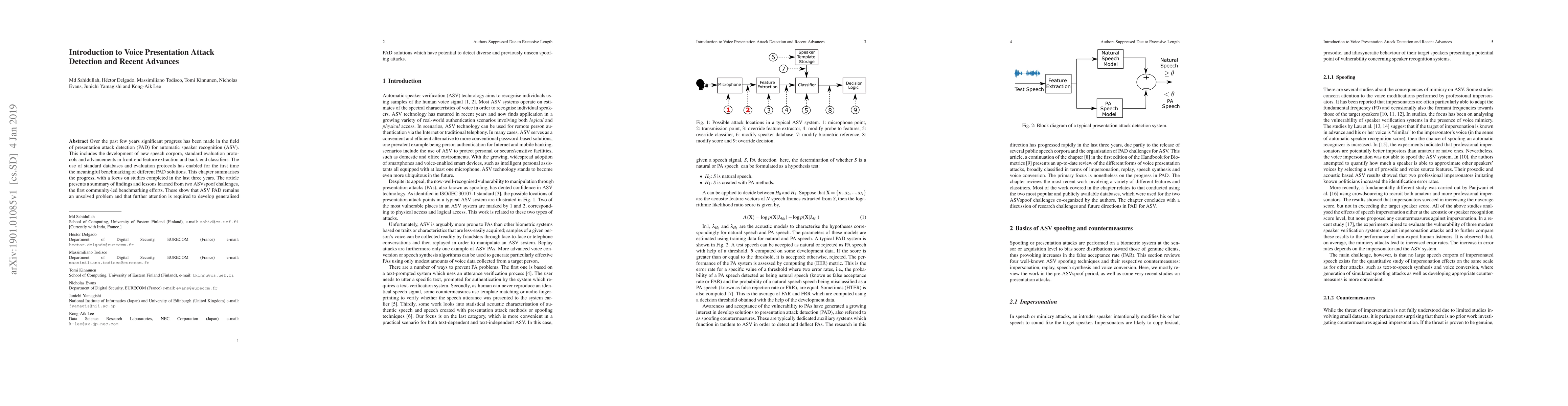This paper reviews recent advancements in voice presentation attack detection (PAD) for automatic speaker verification (ASV), highlighting new speech corpora, evaluation protocols, and improved feature extraction and classifier methods. Despite progress, the paper concludes that generalized PAD solutions capable of detecting diverse spoofing attacks remain elusive.
