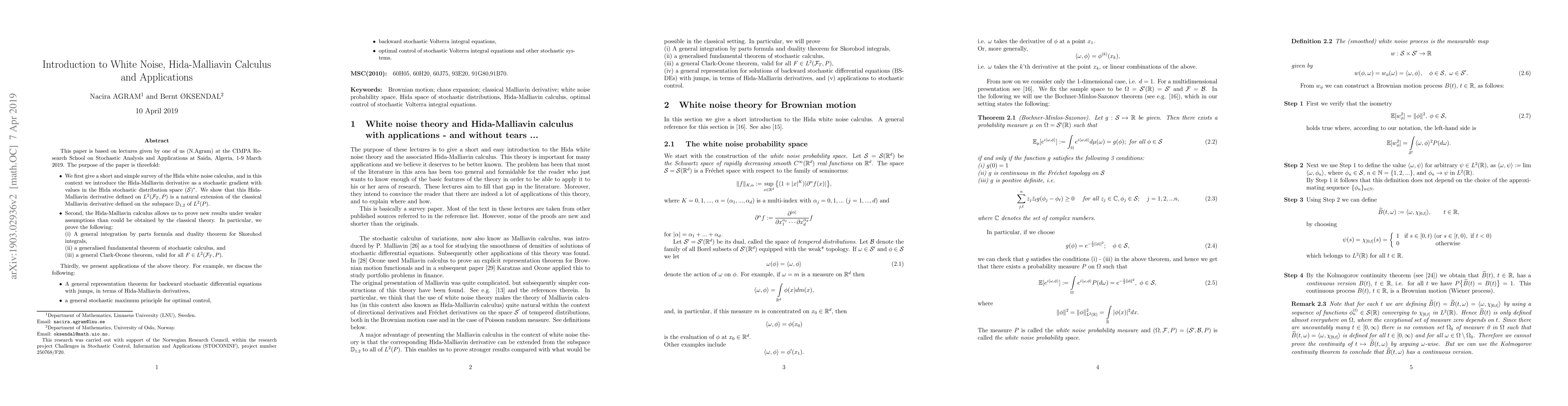 The purpose of these lectures is threefold: We first give a short survey of the Hida white noise calculus, and in this context we introduce the Hida-Malliavin derivative as a stochastic gradient with values in the Hida stochastic distribution space $(\mathcal{S}% )^*$. We show that this Hida-Malliavin derivative defined on $L^2(\mathcal{F}_T,P)$ is a natural extension of the classical Malliavin derivative defined on the subspace $\mathbb{D}_{1,2}$ of $L^2(P)$. The Hida-Malliavin calculus allows us to prove new results under weaker assumptions than could be obtained by the classical theory. In particular, we prove the following: (i) A general integration by parts formula and duality theorem for Skorohod integrals, (ii) a generalised fundamental theorem of stochastic calculus, and (iii) a general Clark-Ocone theorem, valid for all $F \in L^2(\mathcal{F}_T,P)$. As applications of the above theory we prove the following: A general representation theorem for backward stochastic differential equations with jumps, in terms of Hida-Malliavin derivatives; a general stochastic maximum principle for optimal control; backward stochastic Volterra integral equations; optimal control of stochastic Volterra integral equations and other stochastic systems.