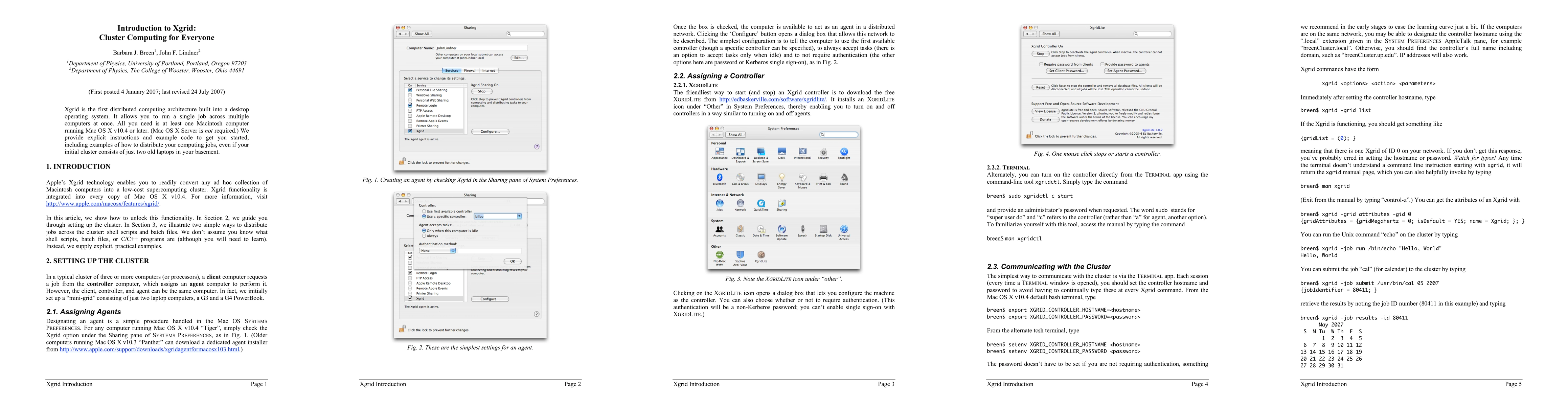 Summary: Xgrid is a pioneering distributed computing architecture integrated into Mac OS X, enabling users to run large jobs across multiple computers simultaneously. It requires at least one Mac OS X v10.4 or later computer, with detailed instructions and example code provided for easy setup, including clustering with minimal hardware.
