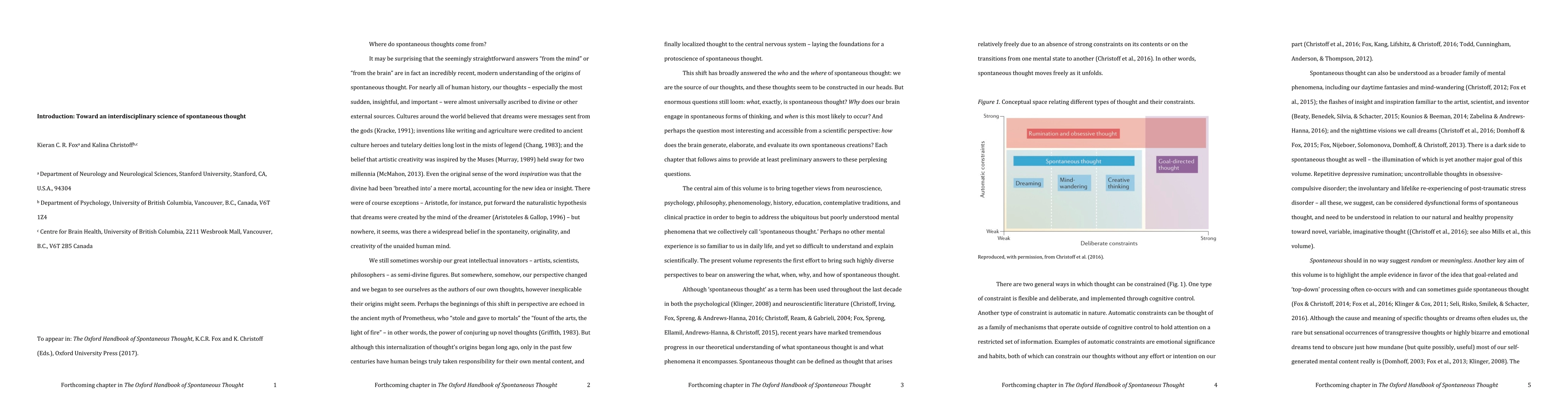 Enormous questions still loom for the emerging science of spontaneous thought: what, exactly, is spontaneous thought? Why does our brain engage in spontaneous forms of thinking, and when is this most likely to occur? And perhaps the question most interesting and accessible from a scientific perspective: how does the brain generate, elaborate, and evaluate its own spontaneous creations? The central aim of this volume is to bring together views from neuroscience, psychology, philosophy, phenomenology, history, education, contemplative traditions, and clinical practice in order to begin to address the ubiquitous but poorly understood mental phenomena that we collectively call 'spontaneous thought.' Perhaps no other mental experience is so familiar to us in daily life, and yet so difficult to understand and explain scientifically. The present volume represents the first effort to bring such highly diverse perspectives to bear on answering the what, when, why, and how of spontaneous thought.