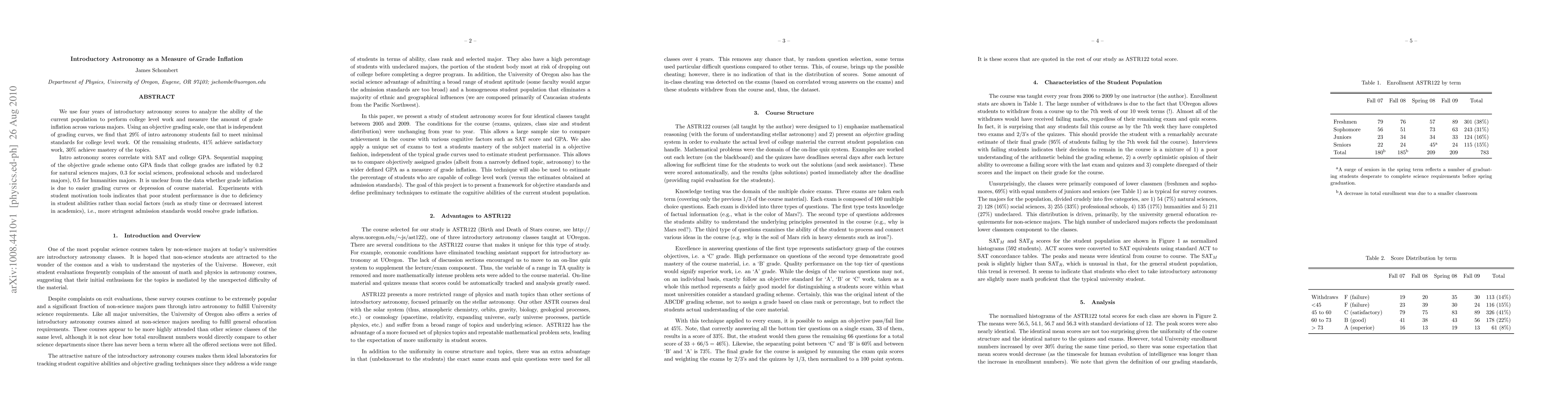 We use four years of introductory astronomy scores to analyze the ability of the current population to perform college level work and measure the amount of grade inflation across various majors. Using an objective grading scale, one that is independent of grading curves, we find that 29% of intro astronomy students fail to meet minimal standards for college level work. Of the remaining students, 41% achieve satisfactory work, 30% achieve mastery of the topics. Intro astronomy scores correlate with SAT and college GPA. Sequential mapping of the objective grade scheme onto GPA finds that college grades are inflated by 0.2 for natural sciences majors, 0.3 for social sciences, professional schools and undeclared majors), 0.5 for humanities majors. It is unclear from the data whether grade inflation is due to easier grading curves or depression of course material. Experiments with student motivation tools indicates that poor student performance is due to deficiency in student abilities rather than social factors (such as study time or decreased interest in academics), i.e., more stringent admission standards would resolve grade inflation.