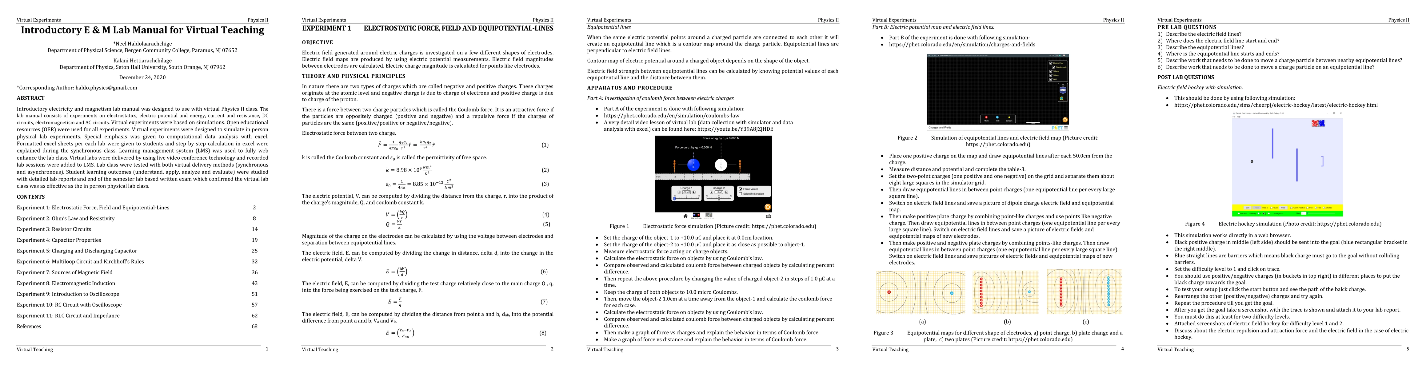 This research paper presents a virtual lab manual for an introductory electricity and magnetism course, utilizing simulations and open educational resources. It evaluates the effectiveness of both synchronous and asynchronous delivery methods in a web-enhanced learning environment, confirming student learning outcomes through detailed lab reports and exams.