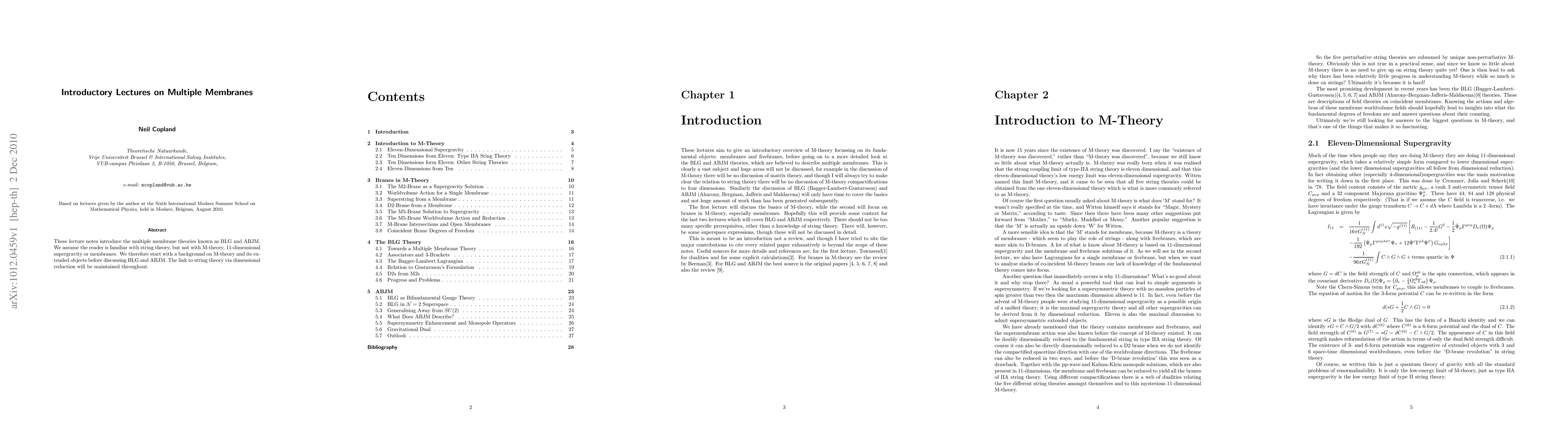 These lecture notes introduce the multiple membrane theories known as BLG and ABJM. We assume the reader is familiar with string theory, but not with M-theory, 11-dimensional supergravity or membranes. We therefore start with a background on M-theory and its extended objects before discussing BLG and ABJM. The link to string theory via dimensional reduction will be maintained throughout.