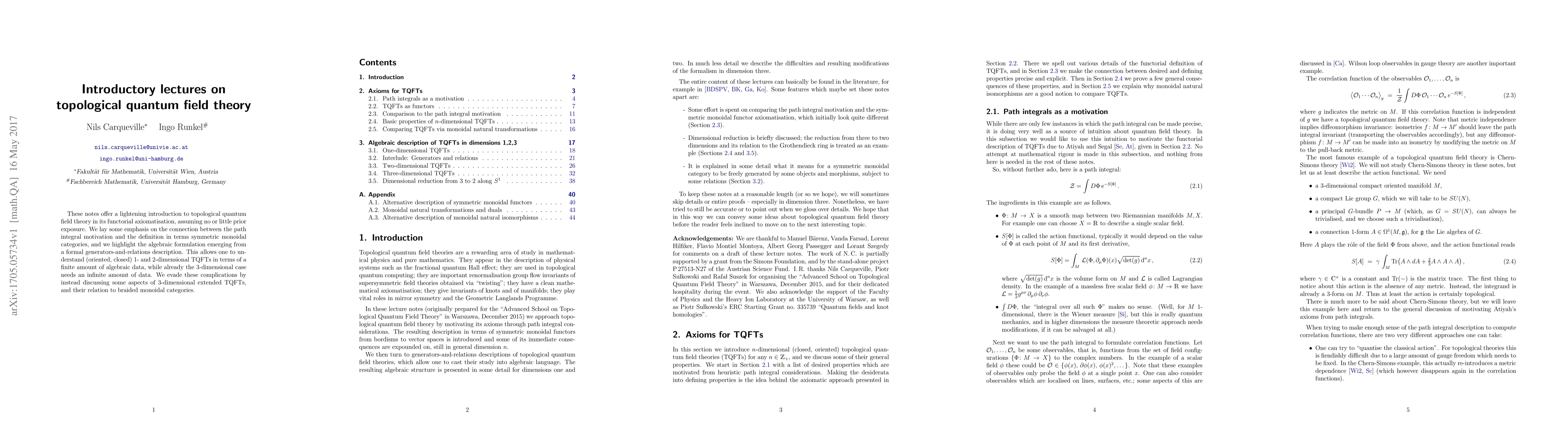 This paper provides an introductory overview of topological quantum field theory (TQFT), focusing on its functorial axiomatisation and the connection between path integral motivation and symmetric monoidal categories. It aims to provide a clear understanding of TQFTs in terms of algebraic data, without delving into the complexities of higher-dimensional cases.