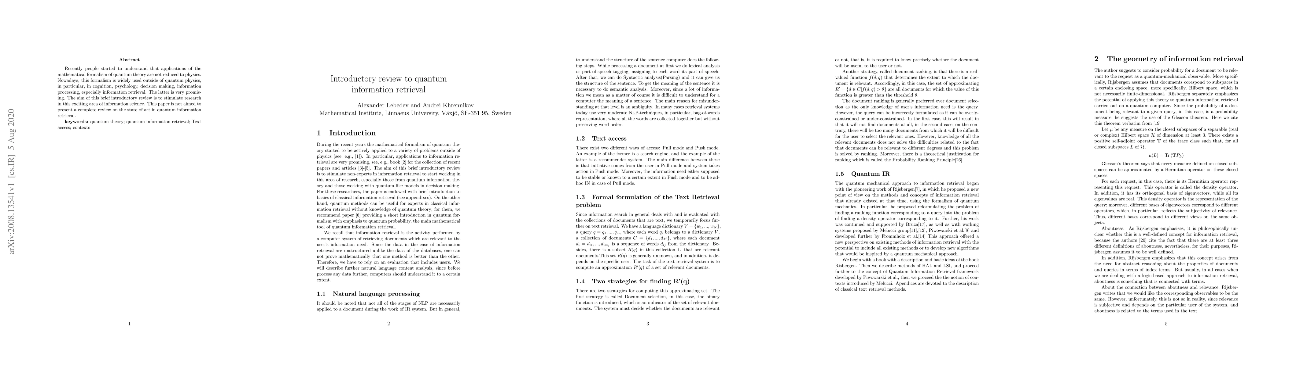 Recently people started to understand that applications of the mathematical formalism of quantum theory are not reduced to physics. Nowadays, this formalism is widely used outside of quantum physics, in particular, in cognition, psychology, decision making, information processing, especially information retrieval. The latter is very promising. The aim of this brief introductory review is to stimulate research in this exciting area of information science. This paper is not aimed to present a complete review on the state of art in quantum information retrieval.