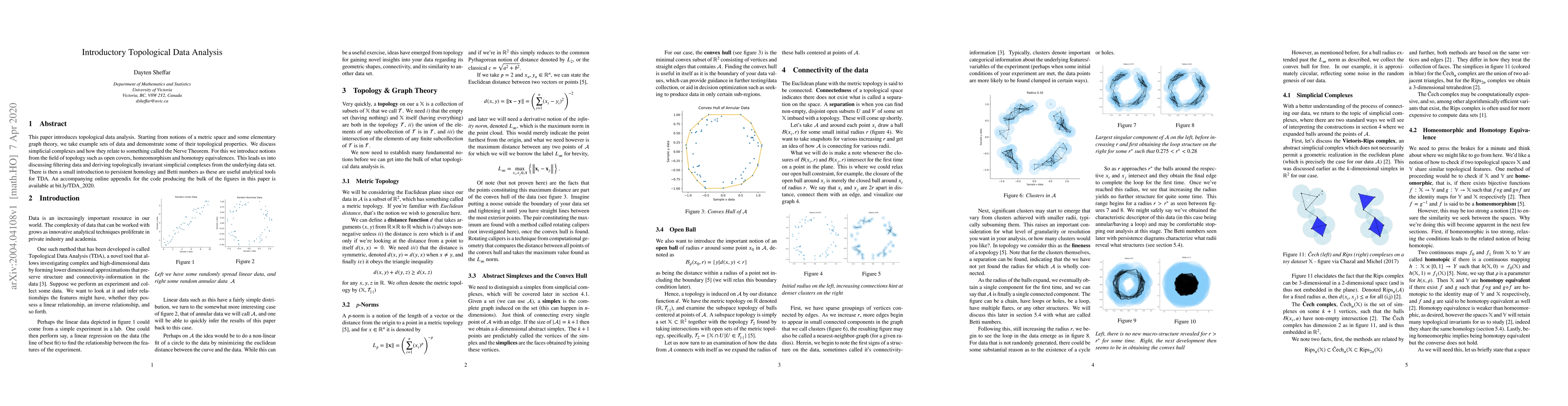 This paper introduces topological data analysis (TDA) by starting from basic notions of metric spaces and elementary graph theory, demonstrating topological properties of example datasets using simplicial complexes and the Nerve Theorem. It discusses filtering data and deriving topologically invariant simplicial complexes, introducing concepts like open covers, homeomorphism, and homotopy equivalences. The paper also provides a small introduction to persistent homology and Betti numbers.