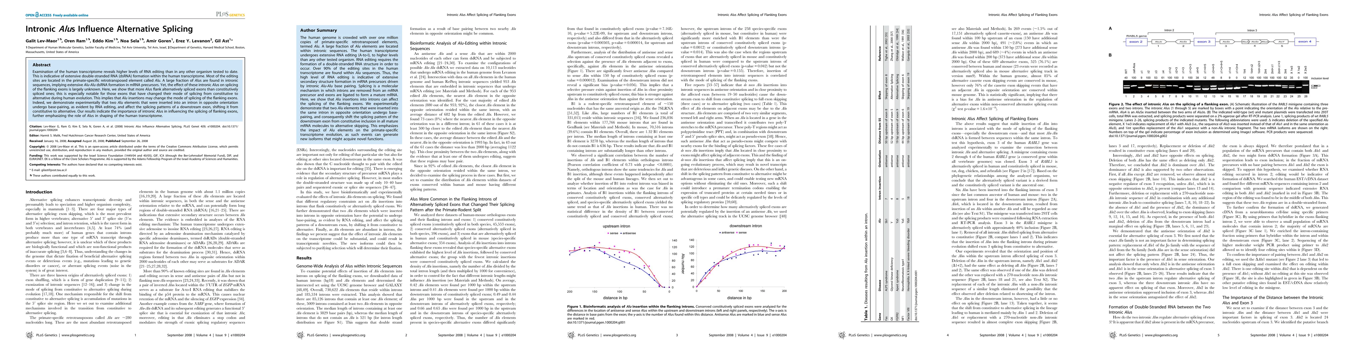 This study reveals that intronic Alu elements significantly influence alternative splicing by forming dsRNA structures, which can alter the splicing patterns of adjacent exons, particularly those that have evolved from constitutive to alternative splicing. Experimental evidence shows that Alu base-pairing affects splicing, highlighting the role of Alus in shaping the human transcriptome.