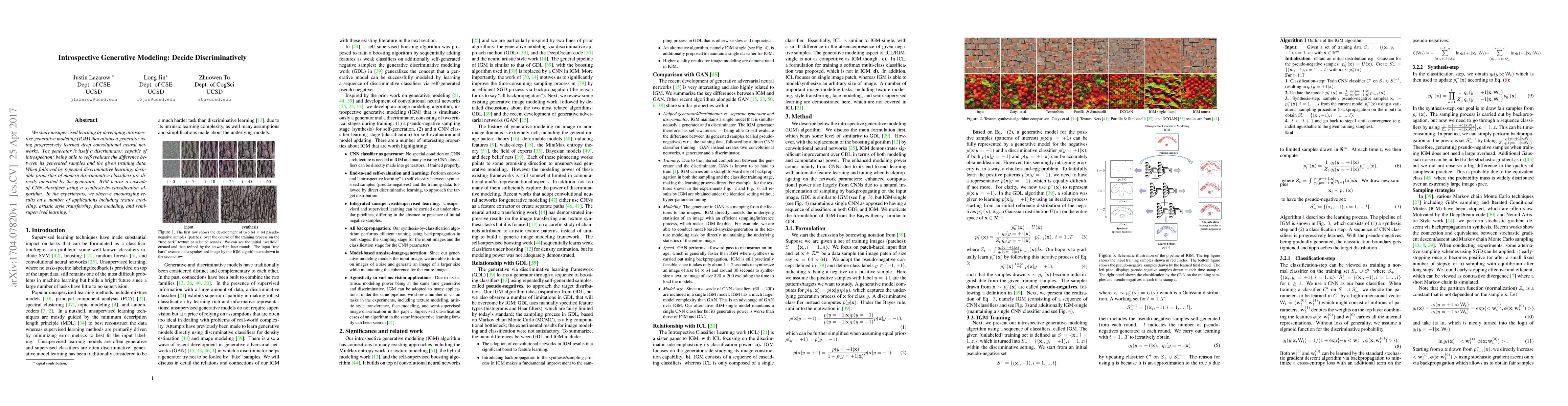 This paper introduces introspective generative modeling (IGM), a method that uses progressively learned deep convolutional neural networks to create a generator that can self-evaluate its outputs. The results show promising applications in texture modeling, artistic style transferring, face modeling, and semi-supervised learning.