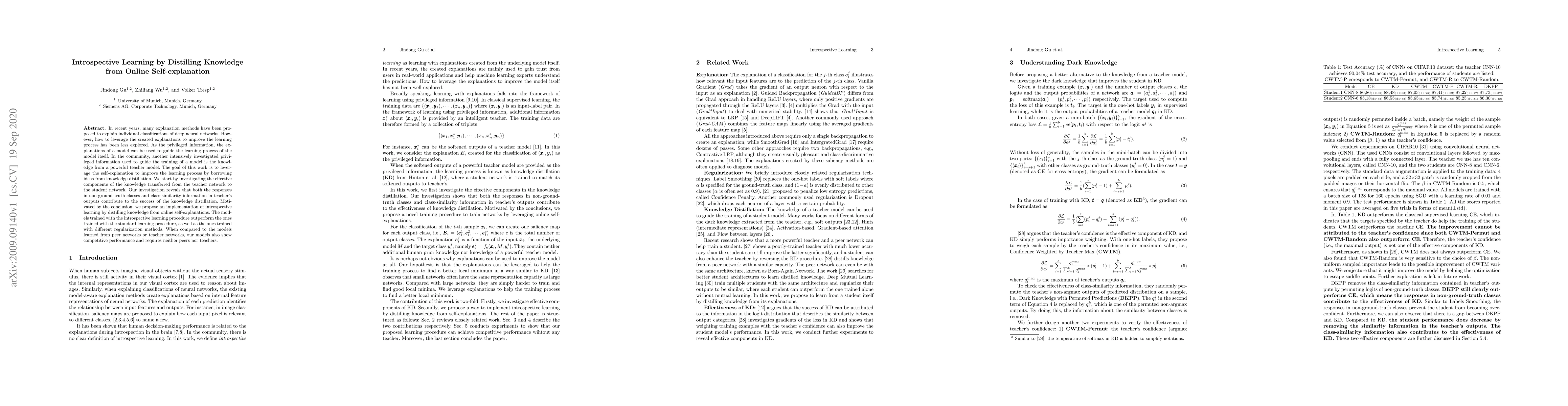 In recent years, many explanation methods have been proposed to explain individual classifications of deep neural networks. However, how to leverage the created explanations to improve the learning process has been less explored. As the privileged information, the explanations of a model can be used to guide the learning process of the model itself. In the community, another intensively investigated privileged information used to guide the training of a model is the knowledge from a powerful teacher model. The goal of this work is to leverage the self-explanation to improve the learning process by borrowing ideas from knowledge distillation. We start by investigating the effective components of the knowledge transferred from the teacher network to the student network. Our investigation reveals that both the responses in non-ground-truth classes and class-similarity information in teacher's outputs contribute to the success of the knowledge distillation. Motivated by the conclusion, we propose an implementation of introspective learning by distilling knowledge from online self-explanations. The models trained with the introspective learning procedure outperform the ones trained with the standard learning procedure, as well as the ones trained with different regularization methods. When compared to the models learned from peer networks or teacher networks, our models also show competitive performance and requires neither peers nor teachers.