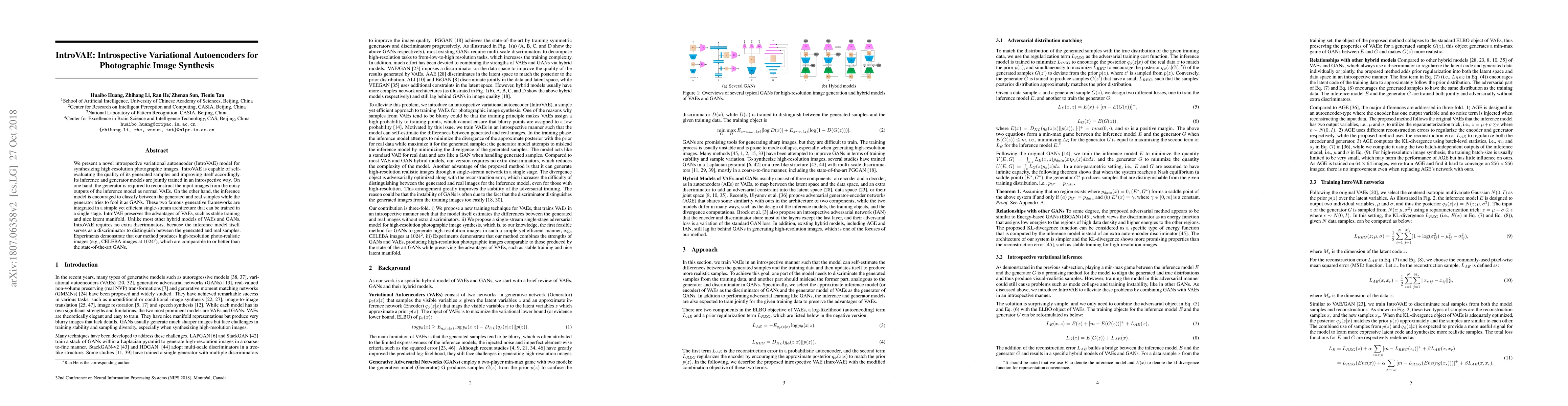 We present a novel introspective variational autoencoder (IntroVAE) model for synthesizing high-resolution photographic images. IntroVAE is capable of self-evaluating the quality of its generated samples and improving itself accordingly. Its inference and generator models are jointly trained in an introspective way. On one hand, the generator is required to reconstruct the input images from the noisy outputs of the inference model as normal VAEs. On the other hand, the inference model is encouraged to classify between the generated and real samples while the generator tries to fool it as GANs. These two famous generative frameworks are integrated in a simple yet efficient single-stream architecture that can be trained in a single stage. IntroVAE preserves the advantages of VAEs, such as stable training and nice latent manifold. Unlike most other hybrid models of VAEs and GANs, IntroVAE requires no extra discriminators, because the inference model itself serves as a discriminator to distinguish between the generated and real samples. Experiments demonstrate that our method produces high-resolution photo-realistic images (e.g., CELEBA images at \(1024^{2}\)), which are comparable to or better than the state-of-the-art GANs.