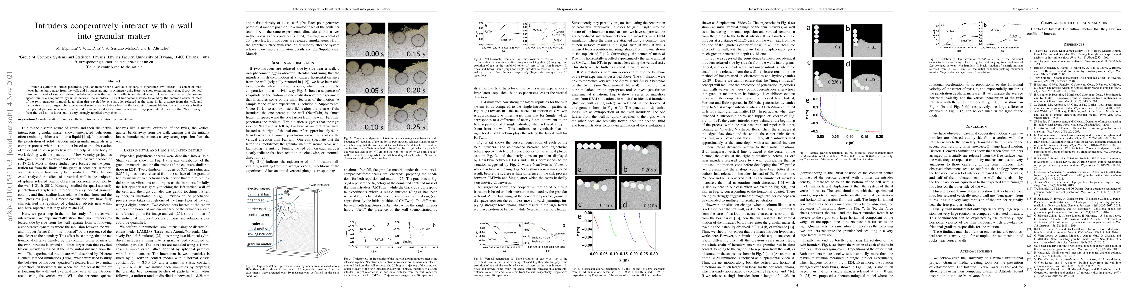 This research experimentally demonstrates that two cylindrical intruders interacting cooperatively with granular matter near a vertical wall exhibit enhanced horizontal displacement and rotation compared to a single intruder. The Discrete Element Method explains these phenomena and reveals that four intruders form a chain that bends away from the wall, experiencing strong repulsion from it.