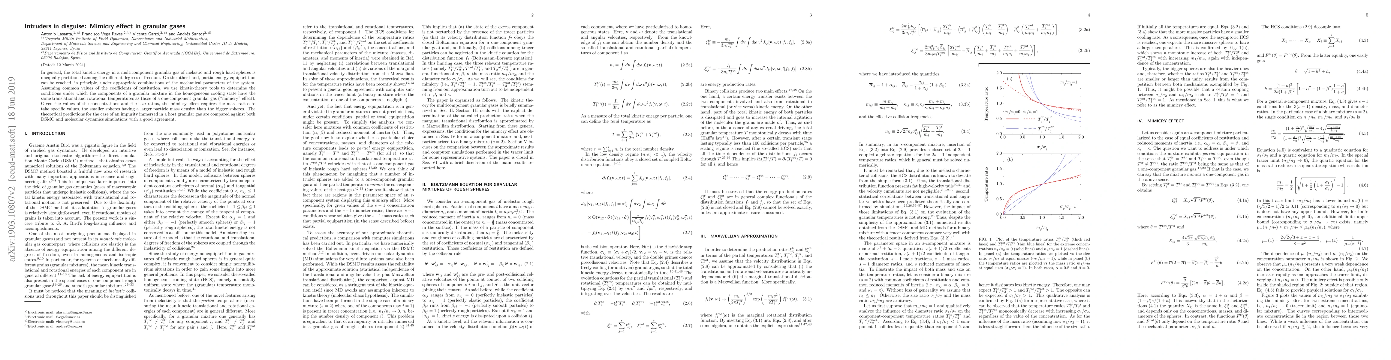 This paper investigates the "mimicry" effect in multicomponent granular gases, where different components achieve equal translational and rotational temperatures despite unequal kinetic energy partitioning. Theoretical predictions for specific mass ratios achieving this effect are validated through simulations, showing good agreement.