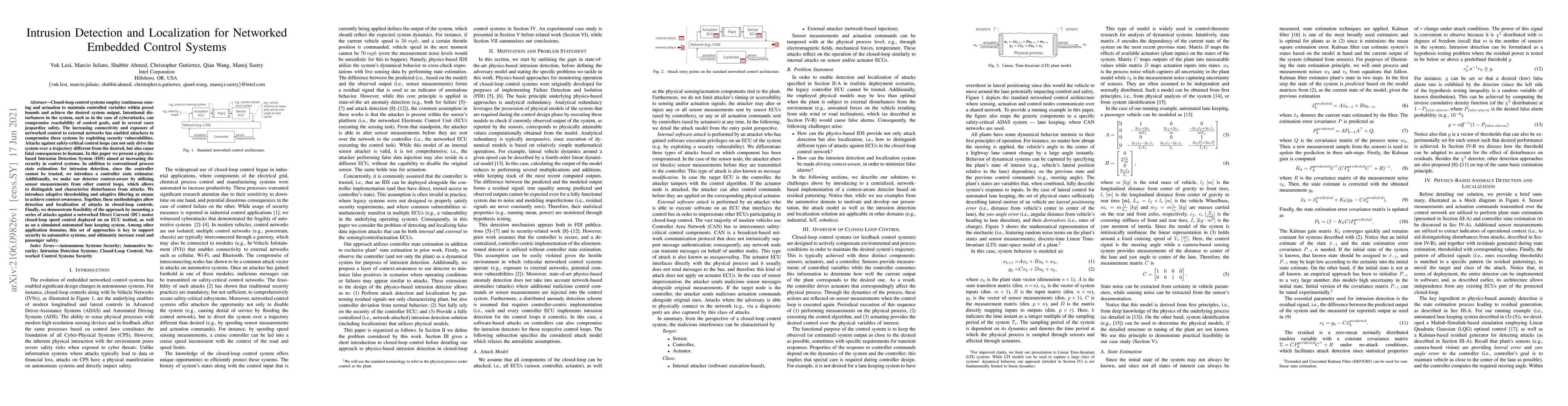 This paper proposes a physics-based Intrusion Detection System (IDS) for networked embedded control systems, introducing a controller state estimator and context-aware detection using adaptive thresholding and filtering. The approach is demonstrated on a DC motor and an automated lane keeping system, aiming to enhance security and safety in automotive applications.