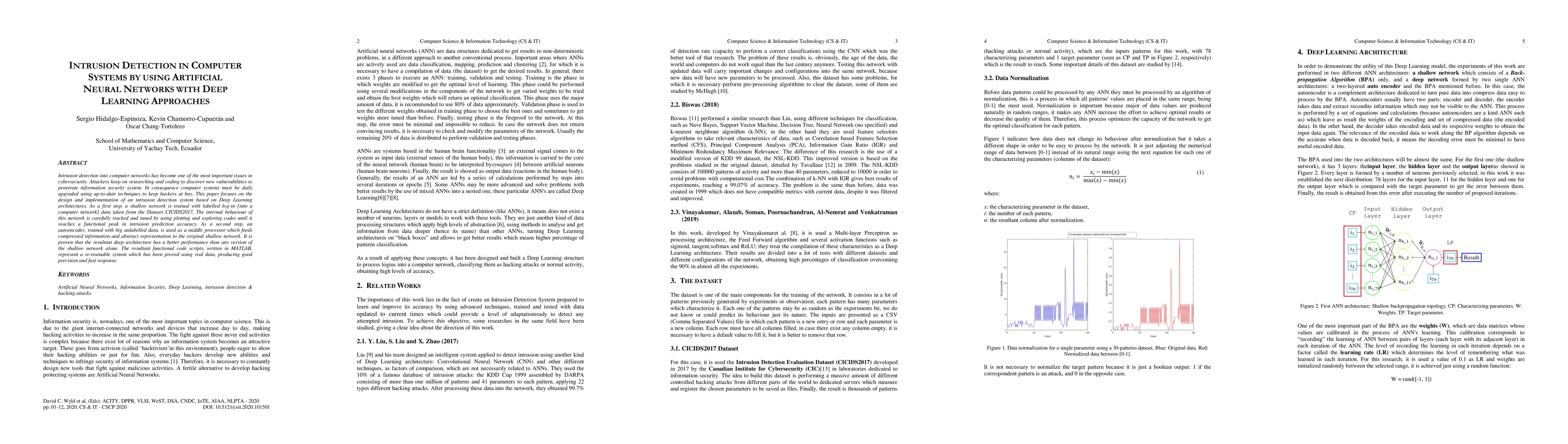This paper develops an advanced intrusion detection system using Deep Learning techniques, initially training a shallow neural network on labelled CICIDS2017 data, then enhancing it with an autoencoder for improved performance, demonstrating superior accuracy and faster response times compared to standalone shallow networks.