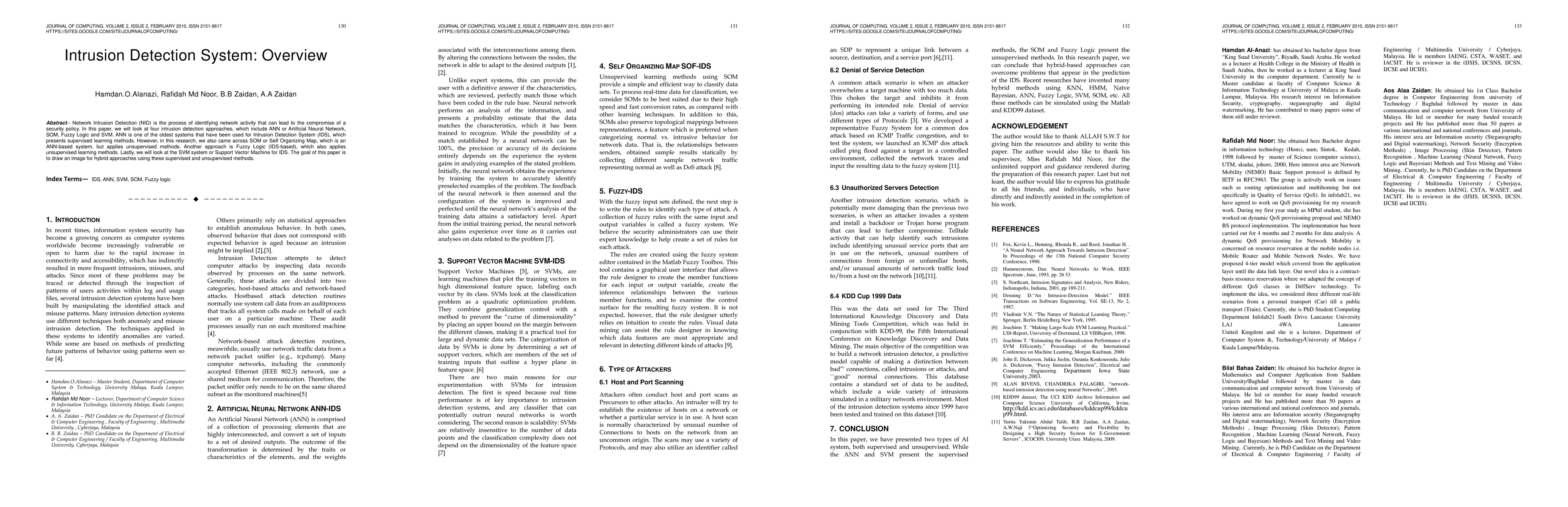 This paper reviews four approaches to Network Intrusion Detection: ANN, SOM, Fuzzy Logic, and SVM. It aims to illustrate hybrid methods combining supervised and unsupervised learning techniques for enhanced IDS performance.