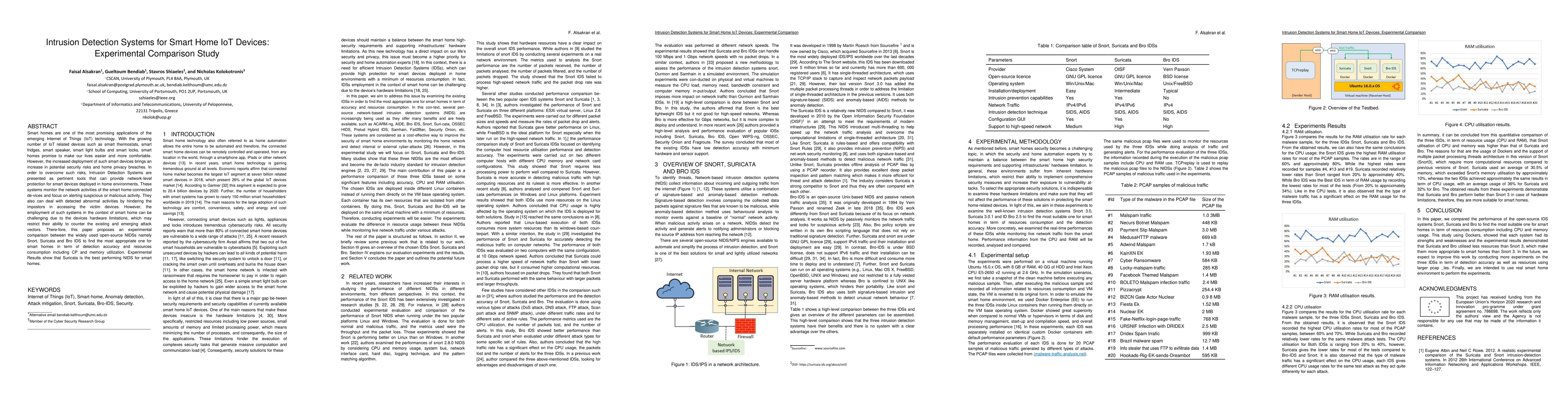 Smart homes are one of the most promising applications of the emerging Internet of Things (IoT) technology. With the growing number of IoT related devices such as smart thermostats, smart fridges, smart speaker, smart light bulbs and smart locks, smart homes promise to make our lives easier and more comfortable. However, the increased deployment of such smart devices brings an increase in potential security risks and home privacy breaches. In order to overcome such risks, Intrusion Detection Systems are presented as pertinent tools that can provide network-level protection for smart devices deployed in home environments. These systems monitor the network activities of the smart home-connected de-vices and focus on alerting suspicious or malicious activity. They also can deal with detected abnormal activities by hindering the impostors in accessing the victim devices. However, the employment of such systems in the context of a smart home can be challenging due to the devices hardware limitations, which may restrict their ability to counter the existing and emerging attack vectors. Therefore, this paper proposes an experimental comparison between the widely used open-source NIDSs namely Snort, Suricata and Bro IDS to find the most appropriate one for smart homes in term of detection accuracy and resources consumption including CP and memory utilization. Experimental Results show that Suricata is the best performing NIDS for smart homes