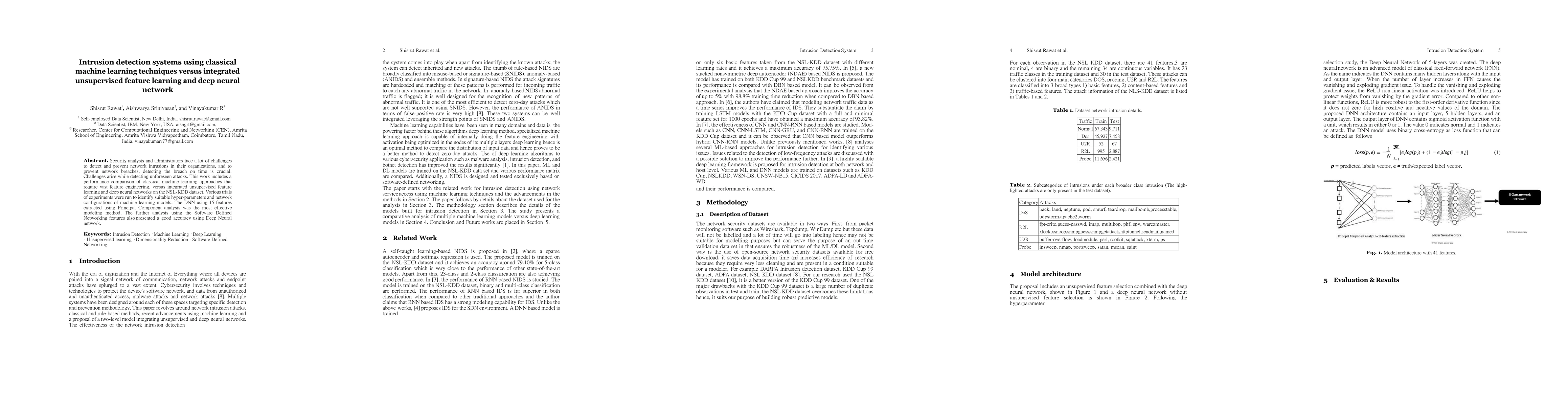 Security analysts and administrators face a lot of challenges to detect and prevent network intrusions in their organizations, and to prevent network breaches, detecting the breach on time is crucial. Challenges arise while detecting unforeseen attacks. This work includes a performance comparison of classical machine learning approaches that require vast feature engineering, versus integrated unsupervised feature learning and deep neural networks on the NSL-KDD dataset. Various trials of experiments were run to identify suitable hyper-parameters and network configurations of machine learning models. The DNN using 15 features extracted using Principal Component analysis was the most effective modeling method. The further analysis using the Software Defined Networking features also presented a good accuracy using Deep Neural network.