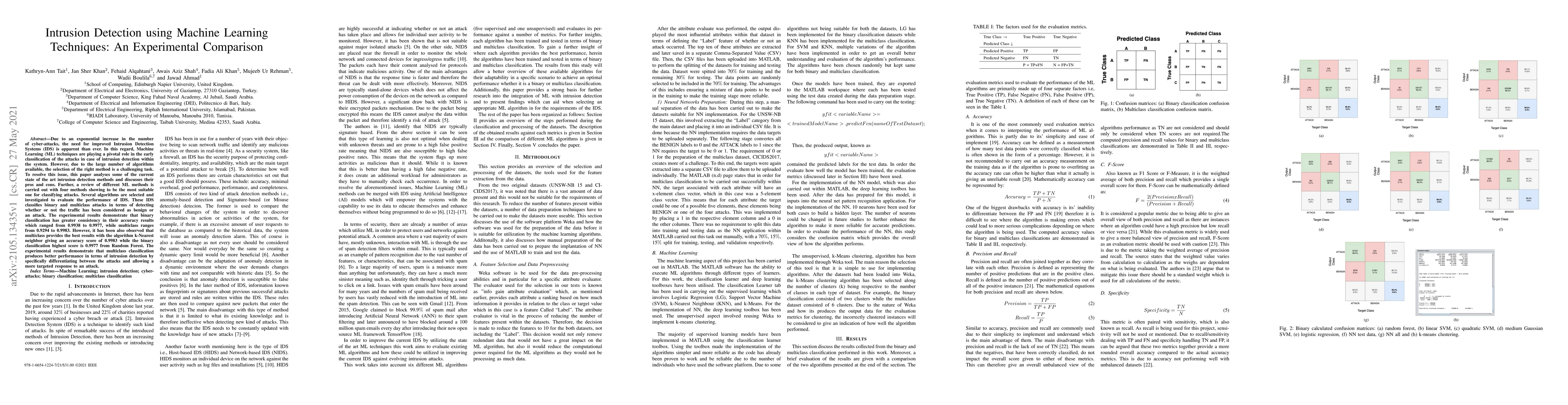 Due to an exponential increase in the number of cyber-attacks, the need for improved Intrusion Detection Systems (IDS) is apparent than ever. In this regard, Machine Learning (ML) techniques are playing a pivotal role in the early classification of the attacks in case of intrusion detection within the system. However, due to a large number of algorithms available, the selection of the right method is a challenging task. To resolve this issue, this paper analyses some of the current state-of-the-art intrusion detection methods and discusses their pros and cons. Further, a review of different ML methods is carried out with four methods showing to be the most suitable one for classifying attacks. Several algorithms are selected and investigated to evaluate the performance of IDS. These IDS classifies binary and multiclass attacks in terms of detecting whether or not the traffic has been considered as benign or an attack. The experimental results demonstrate that binary classification has greater consistency in their accuracy results which ranged from 0.9938 to 0.9977, while multiclass ranges from 0.9294 to 0.9983. However, it has been also observed that multiclass provides the best results with the algorithm k-Nearest neighbor giving an accuracy score of 0.9983 while the binary classification highest score is 0.9977 from Random Forest. The experimental results demonstrate that multiclass classification produces better performance in terms of intrusion detection by specifically differentiating between the attacks and allowing a more targeted response to an attack.