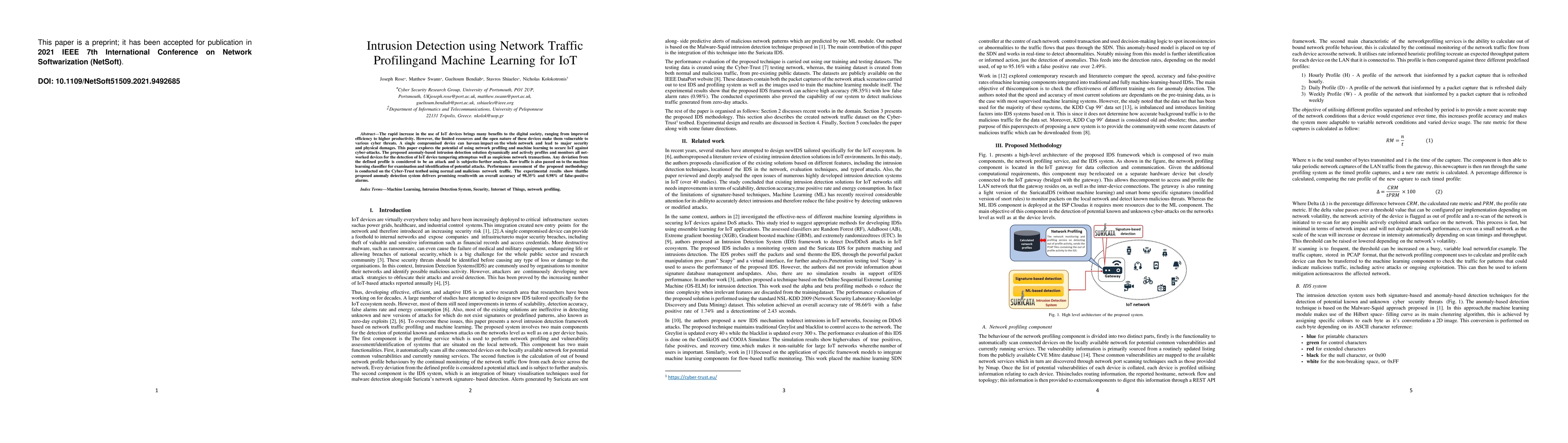 This paper proposes an anomaly-based intrusion detection system for IoT using network traffic profiling and machine learning, achieving 98.35% accuracy and 0.98% false-positive rate in detecting IoT device tampering and suspicious transactions. Experimental results on the Cyber-Trust testbed demonstrate its effectiveness.