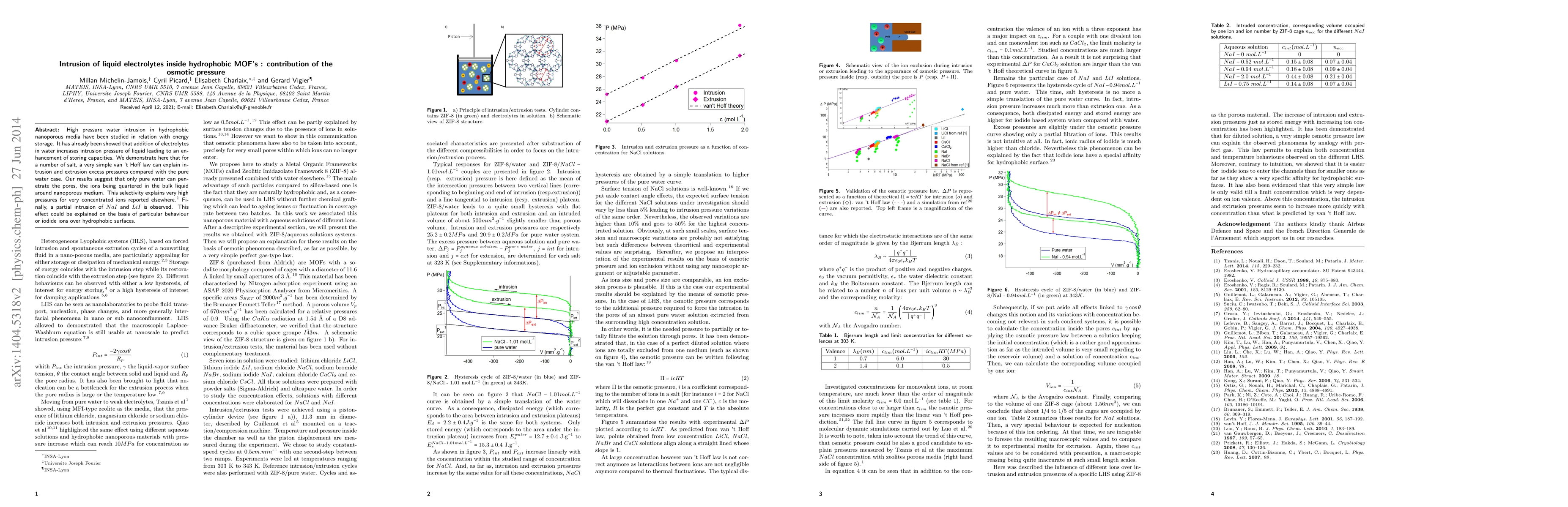 This study investigates the intrusion of liquid electrolytes into hydrophobic metal-organic frameworks (MOFs) and finds that osmotic pressure significantly enhances storage capacity. The van't Hoff law explains the intrusion and extrusion pressures, revealing that only pure water penetrates the pores while ions remain in the bulk liquid, explaining high pressures for concentrated salts.