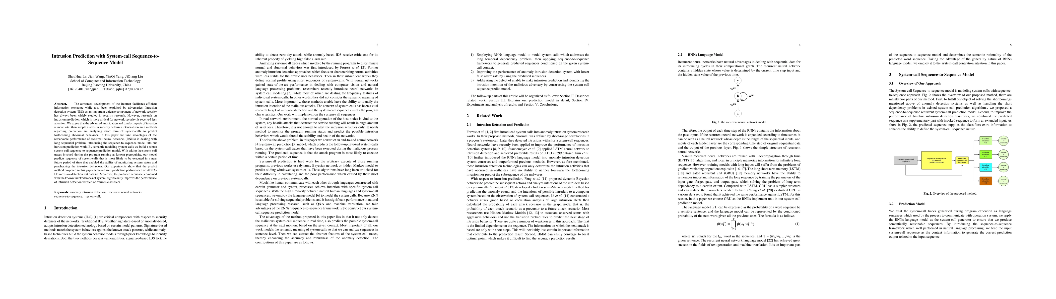 The advanced development of the Internet facilitates efficient information exchange while also been exploited by adversaries. Intrusion detection system (IDS) as an important defense component of network security has always been widely studied in security research. However, research on intrusion prediction, which is more critical for network security, is received less attention. We argue that the advanced anticipation and timely impede of invasion is more vital than simple alarms in security defenses. General research methods regarding prediction are analyzing short term of system-calls to predict forthcoming abnormal behaviors. In this paper we take advantages of the remarkable performance of recurrent neural networks (RNNs) in dealing with long sequential problem, introducing the sequence-to-sequence model into our intrusion prediction work. By semantic modeling system-calls we build a robust system-call sequence-to-sequence prediction model. With taking the system-call traces invoked during the program running as known prerequisite, our model predicts sequence of system-calls that is most likely to be executed in a near future period of time that enabled the ability of monitoring system status and prophesying the intrusion behaviors. Our experiments show that the predict method proposed in this paper achieved well prediction performance on ADFALD intrusion detection test data set. Moreover, the predicted sequence, combined with the known invoked traces of system, significantly improves the performance of intrusion detection verified on various classifiers.