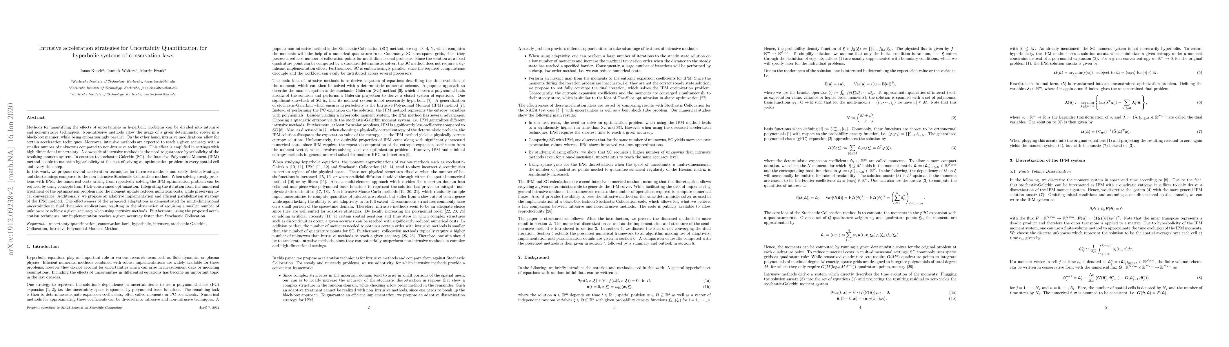 Methods for quantifying the effects of uncertainties in hyperbolic problems can be divided into intrusive and non-intrusive techniques. Non-intrusive methods allow the usage of a given deterministic solver in a black-box manner, while being embarrassingly parallel. However, avoiding intrusive modifications of a given solver takes away the ability to use several inherently intrusive numerical acceleration tools. Moreover, intrusive methods are expected to reach a given accuracy with a smaller number of unknowns compared to non-intrusive techniques. This effect is amplified in settings with high dimensional uncertainty. A downside of intrusive methods is however the need to guarantee hyperbolicity of the resulting moment system. In contrast to stochastic-Galerkin (SG), the Intrusive Polynomial Moment (IPM) method is able to maintain hyperbolicity at the cost of solving an optimization problem in every spatial cell and every time step. In this work, we propose several acceleration techniques for intrusive methods and study their advantages and shortcomings compared to the non-intrusive Stochastic Collocation method. When solving steady problems with IPM, the numerical costs arising from repeatedly solving the IPM optimization problem can be reduced by using concepts from PDE-constrained optimization. Additionally, we propose an adaptive implementation and efficient parallelization strategy of the IPM method. The effectiveness of the proposed adaptations is demonstrated for multi-dimensional uncertainties in fluid dynamics applications, resulting in the observation of requiring a smaller number of unknowns to achieve a given accuracy when using intrusive methods. Furthermore, using the proposed acceleration techniques, our implementation reaches a given accuracy faster than Stochastic Collocation.