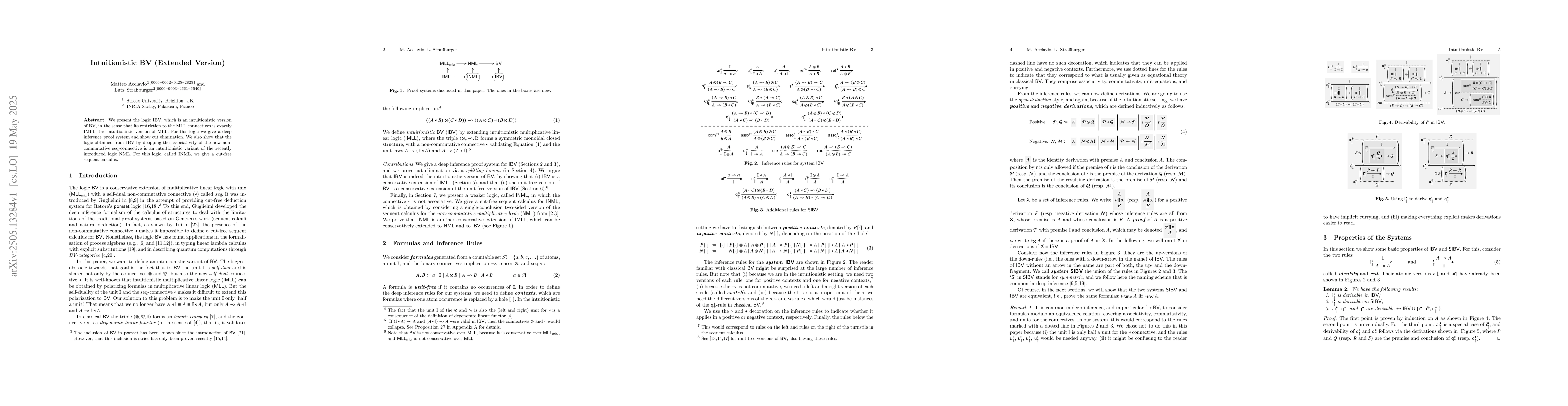 This paper introduces IBV, an intuitionistic version of BV logic, with a deep inference proof system and cut elimination. It also connects to other logics like NML, providing new sequent calculi.