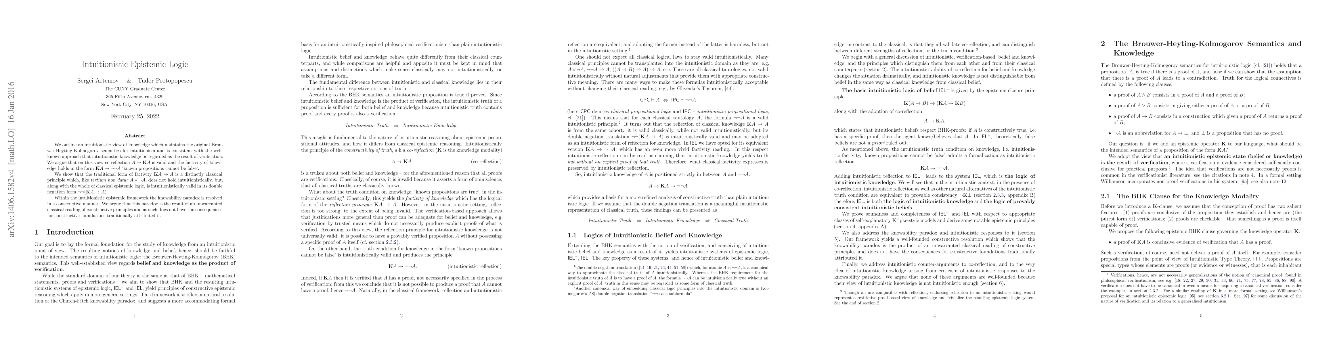 We outline an intuitionistic view of knowledge which maintains the original Brou\-wer-Heyting-Kolmogorov semantics for intuitionism and is consistent with the well-known approach that intuitionistic knowledge be regarded as the result of verification. We argue that on this view co-reflection $A \rightarrow {\bf{K}} A$ is valid and the factivity of knowledge holds in the form ${\bf{K}} A \rightarrow \neg\neg A$ `known propositions cannot be false'. We show that the traditional form of factivity ${\bf{K}} A \rightarrow A$ is a distinctly classical principle which, like {\it tertium non datur} $A\vee\neg A$, does not hold intuitionistically, but, along with the whole of classical epistemic logic, is intuitionistically valid in its double negation form $\neg\neg({\bf{K}} A\rightarrow A)$. Within the intuitionistic epistemic framework the knowability paradox is resolved in a constructive manner. We argue that this paradox is the result of an unwarranted classical reading of constructive principles and as such does not have the consequences for constructive foundations traditionally attributed it.