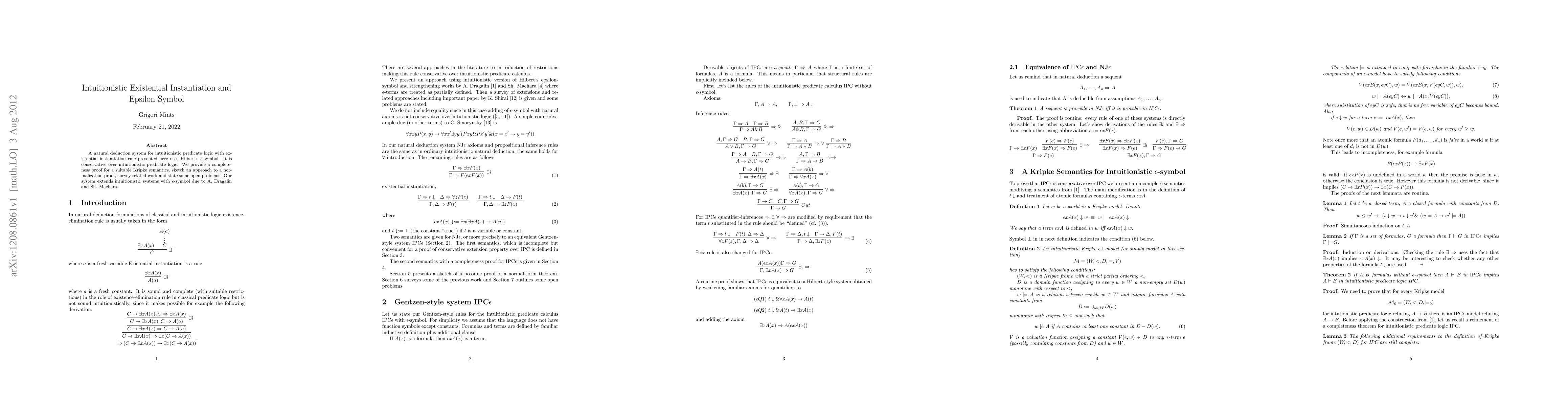 This paper presents a natural deduction system for intuitionistic predicate logic with an existential instantiation rule using Hilbert's $ε$-symbol, providing a completeness proof and surveying related work.