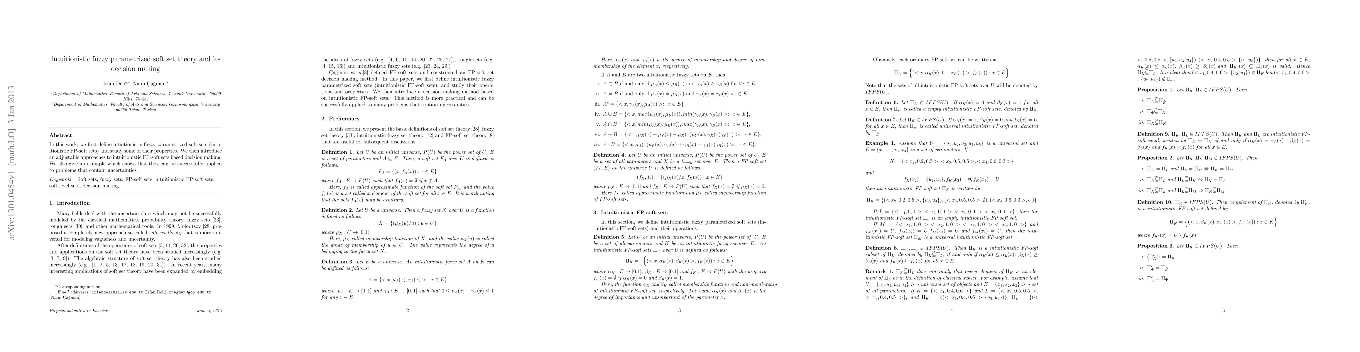 Summary: This paper defines intuitionistic fuzzy parametrized soft sets and explores their properties, then proposes adjustable approaches for decision making based on these sets, demonstrating their effectiveness in handling uncertainties through an example.