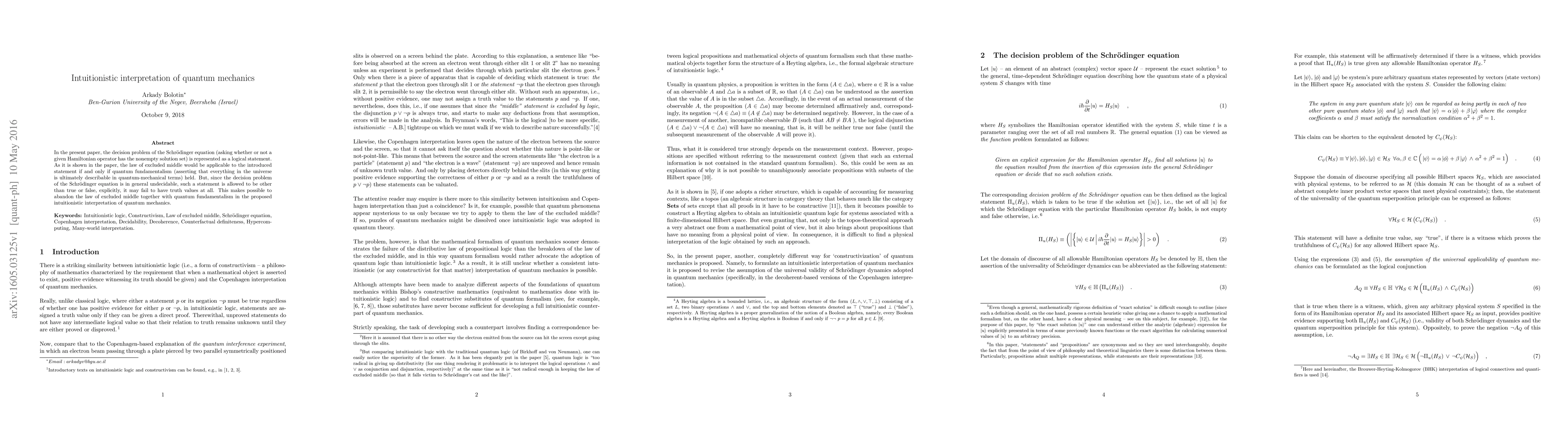 This paper proposes an intuitionistic interpretation of quantum mechanics, suggesting that the Schrödinger equation's decision problem is not necessarily true or false, but can be undecidable, allowing for a non-classical approach to understanding reality.