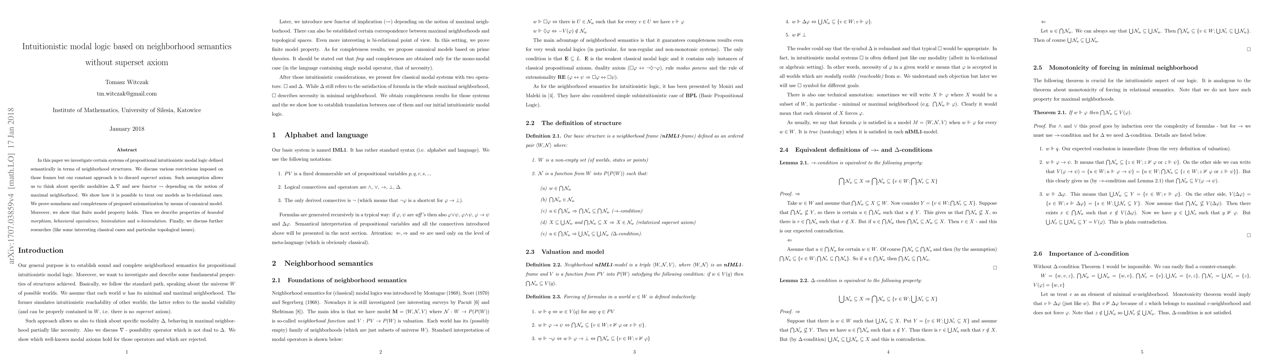 In this paper we investigate certain systems of propositional intuitionistic modal logic defined semantically in terms of neighborhood structures. We discuss various restrictions imposed on those frames but our constant approach is to discard superset axiom. Such assumption allows us to think about specific modalities $\Delta, \nabla$ and new functor $\rightsquigarrow$ depending on the notion of maximal neighborhood. We show how it is possible to treat our models as bi-relational ones. We prove soundness and completeness of proposed axiomatization by means of canonical model. Moreover, we show that finite model property holds. Then we describe properties of bounded morphism, behavioral equivalence, bisimulation and n-bisimulation. Finally, we discuss further researches (like some interesting classical cases and particular topological issues).
