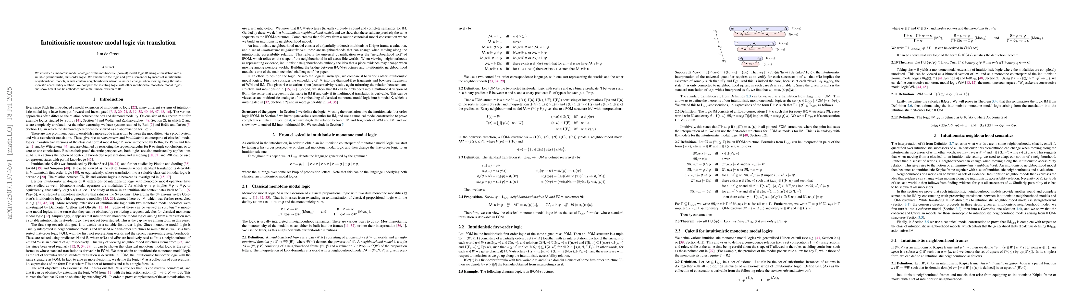 The research introduces an intuitionistic monotone modal logic (IM) via translation from a suitable intuitionistic first-order logic (IFOM). It provides an axiomatization and semantics using intuitionistic neighborhood models where neighborhoods can change along the intuitionistic accessibility relation.
