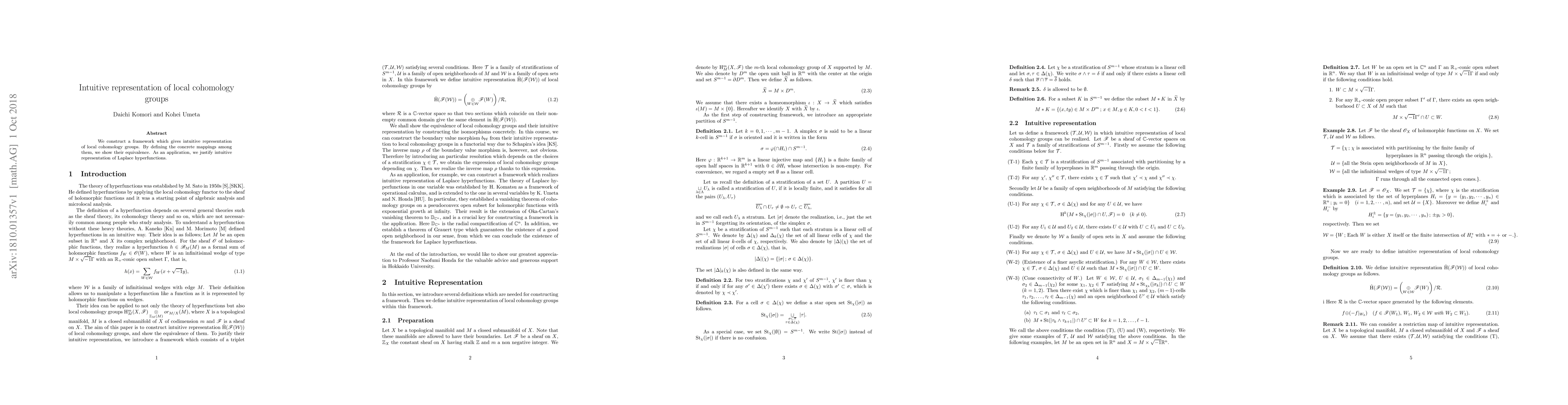 We construct a framework which gives intuitive representation of local cohomology groups. By defining the concrete mappings among them, we show their equivalence. As an application, we justify intuitive representation of Laplace hyperfunctions.