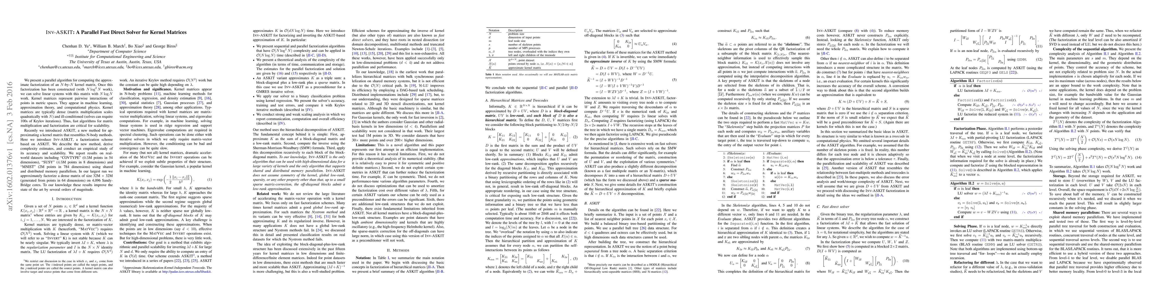 This paper introduces INV-ASKIT, a parallel fast direct solver for kernel matrices, which approximates factorization in $N \log^2 N$ work and solves linear systems in $N \log N$ work. The method significantly improves scalability and efficiency for dense, ill-conditioned kernel matrices used in machine learning and computational physics.