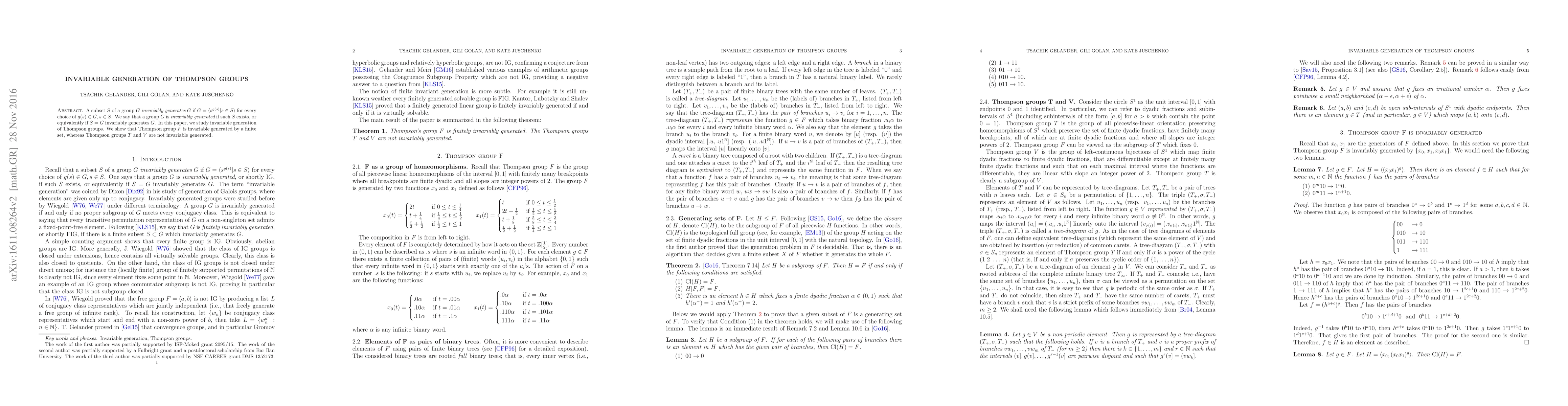 This paper investigates invariable generation of Thompson groups, proving that Thompson group $F$ is invariably generated by a finite set, while Thompson groups $T$ and $V$ are not. Invariable generation implies that a group can be generated by a set invariant under conjugation by any group element.