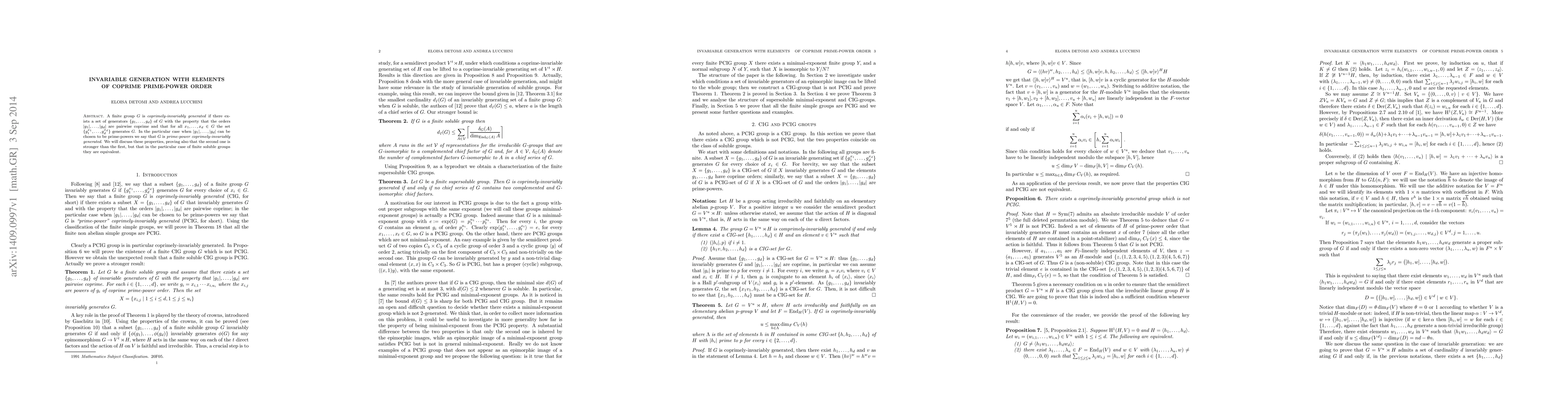 A finite group $G$ is coprimely-invariably generated if there exists a set of generators $\{g_1, \ldots, g_d\}$ of $G$ with the property that the orders $|g_1|, \ldots, |g_d|$ are pairwise coprime and that for all $x_1, \ldots, x_d \in G$ the set $\{g_1^{x_1}, \ldots, g_d^{x_d}\}$ generates $G$. In the particular case when $|g_1|, \ldots, |g_d|$ can be chosen to be prime-powers we say that $G$ is prime-power coprimely-invariably generated. We will discuss these properties, proving also that the second one is stronger than the first, but that in the particular case of finite soluble groups they are equivalent.