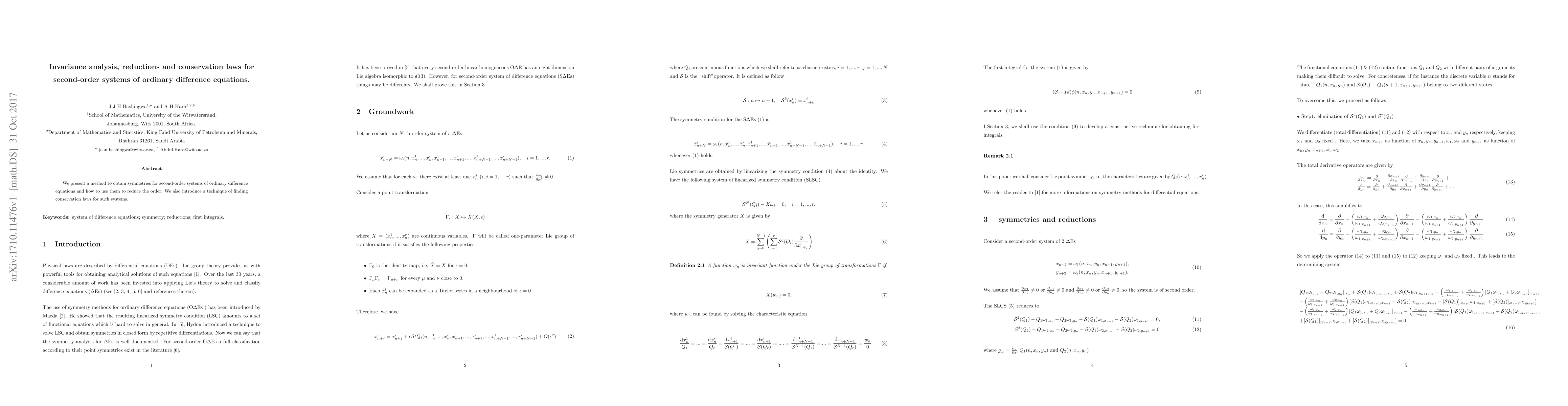 A method to identify symmetries in second-order systems of ordinary difference equations is presented, enabling order reduction and the discovery of conservation laws.