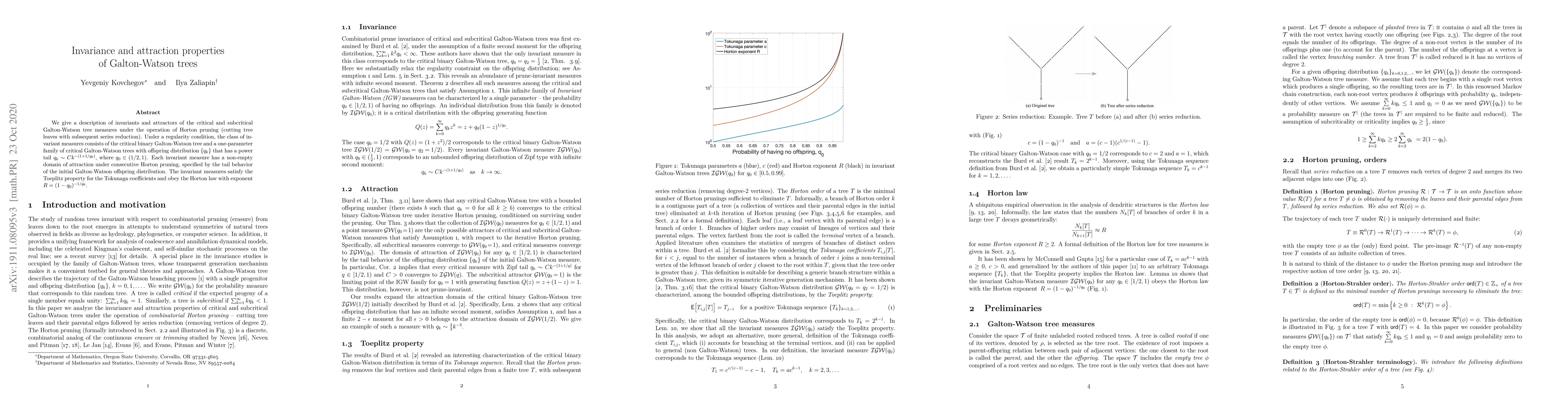 The paper analyzes the invariance and attractor properties of Galton-Watson trees under Horton pruning, providing a description of invariant measures and their domains of attraction.