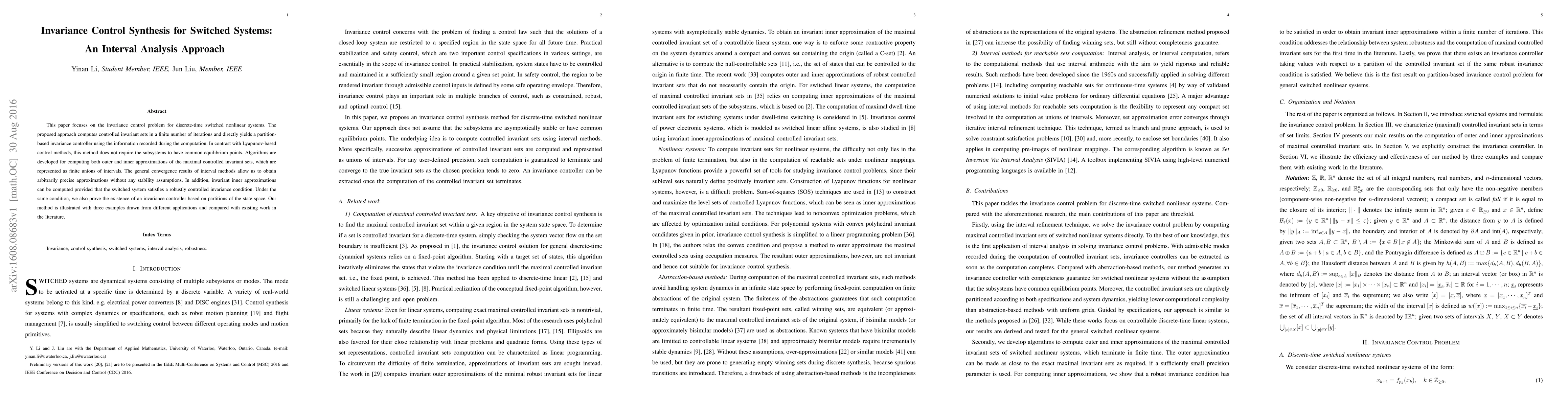 This paper proposes an interval analysis approach for synthesizing invariance controllers for discrete-time switched nonlinear systems, achieving precise approximations without stability assumptions. The method computes maximal controlled invariant sets and proves the existence of an invariance controller based on state space partitions.