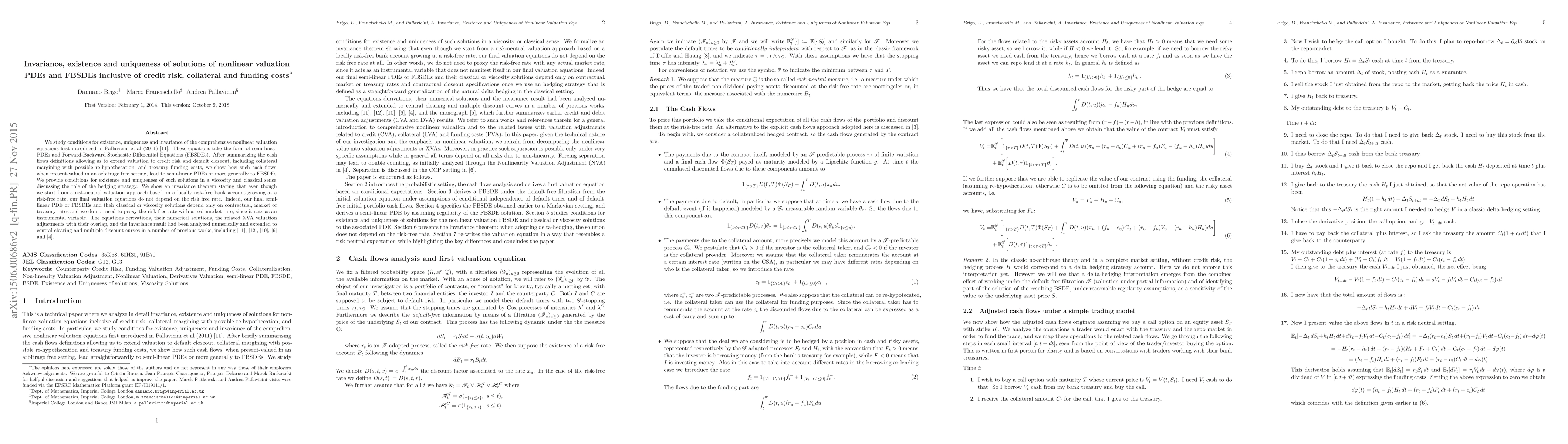 We study conditions for existence, uniqueness and invariance of the comprehensive nonlinear valuation equations first introduced in Pallavicini et al (2011). These equations take the form of semilinear PDEs and Forward-Backward Stochastic Differential Equations (FBSDEs). After summarizing the cash flows definitions allowing us to extend valuation to credit risk and default closeout, including collateral margining with possible re-hypothecation, and treasury funding costs, we show how such cash flows, when present-valued in an arbitrage free setting, lead to semi-linear PDEs or more generally to FBSDEs. We provide conditions for existence and uniqueness of such solutions in a viscosity and classical sense, discussing the role of the hedging strategy. We show an invariance theorem stating that even though we start from a risk-neutral valuation approach based on a locally risk-free bank account growing at a risk-free rate, our final valuation equations do not depend on the risk free rate. Indeed, our final semilinear PDE or FBSDEs and their classical or viscosity solutions depend only on contractual, market or treasury rates and we do not need to proxy the risk free rate with a real market rate, since it acts as an instrumental variable. The equations derivations, their numerical solutions, the related XVA valuation adjustments with their overlap, and the invariance result had been analyzed numerically and extended to central clearing and multiple discount curves in a number of previous works, including Pallavicini et al (2011), Pallavicini et al (2012), Brigo et al (2013), Brigo and Pallavicini (2014), and Brigo et al (2014).