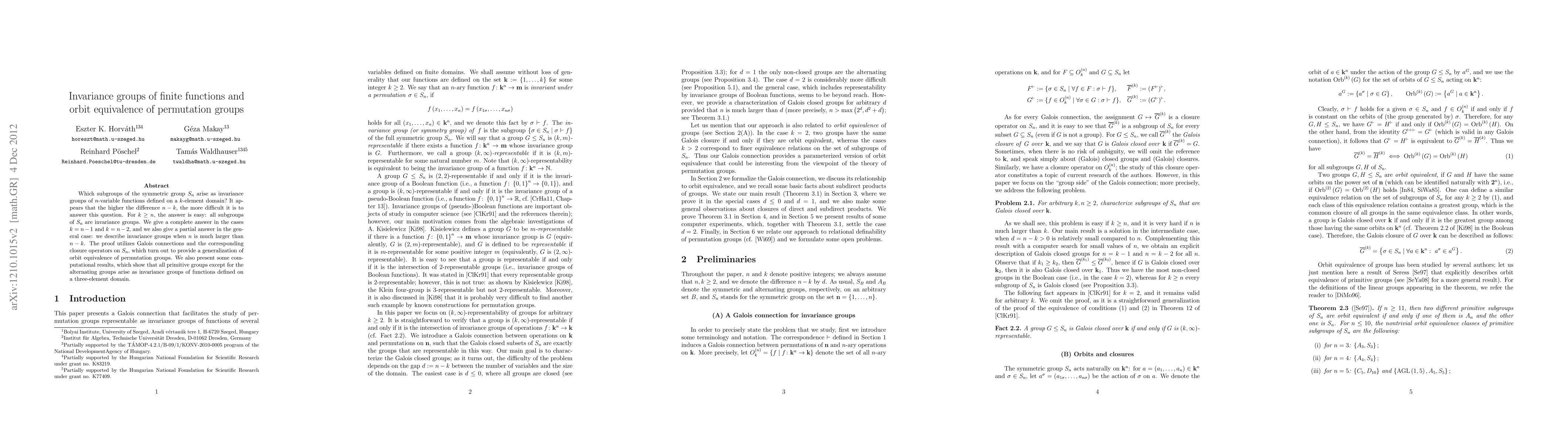 This paper investigates which subgroups of the symmetric group S_n can serve as invariance groups for n-variable functions on a k-element domain, providing complete answers for k=n-1 and k=n-2, and a partial answer for general cases. The study employs Galois connections and closure operators to generalize orbit equivalence of permutation groups.