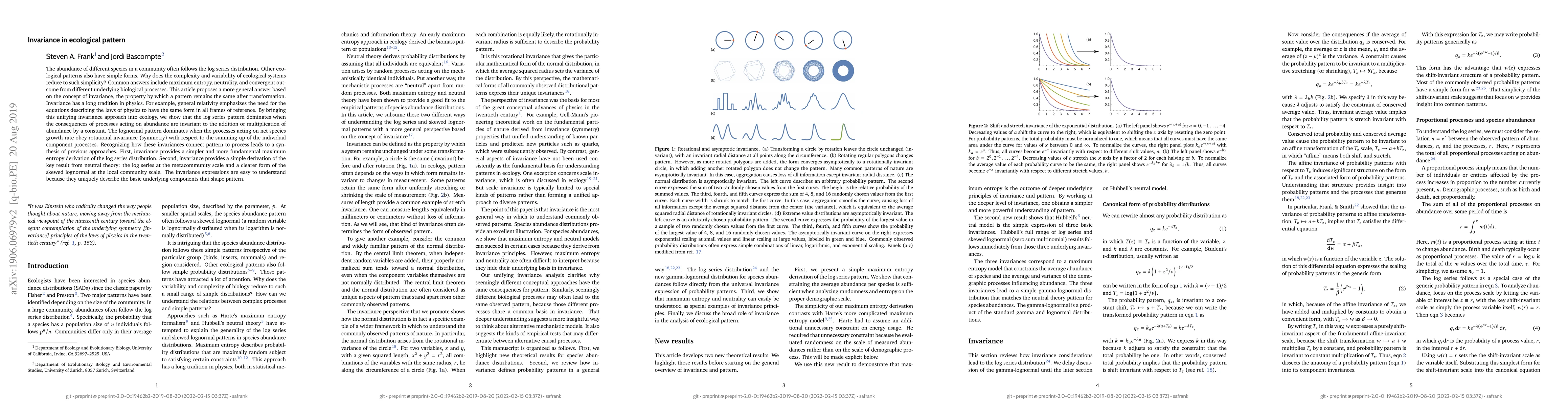 The abundance of different species in a community often follows the log series distribution. Other ecological patterns also have simple forms. Why does the complexity and variability of ecological systems reduce to such simplicity? Common answers include maximum entropy, neutrality, and convergent outcome from different underlying biological processes. This article proposes a more general answer based on the concept of invariance, the property by which a pattern remains the same after transformation. Invariance has a long tradition in physics. For example, general relativity emphasizes the need for the equations describing the laws of physics to have the same form in all frames of reference. By bringing this unifying invariance approach into ecology, we show that the log series pattern dominates when the consequences of processes acting on abundance are invariant to the addition or multiplication of abundance by a constant. The lognormal pattern dominates when the processes acting on net species growth rate obey rotational invariance (symmetry) with respect to the summing up of the individual component processes. Recognizing how these invariances connect pattern to process leads to a synthesis of previous approaches. First, invariance provides a simpler and more fundamental maximum entropy derivation of the log series distribution. Second, invariance provides a simple derivation of the key result from neutral theory: the log series at the metacommunity scale and a clearer form of the skewed lognormal at the local community scale. The invariance expressions are easy to understand because they uniquely describe the basic underlying components that shape pattern.