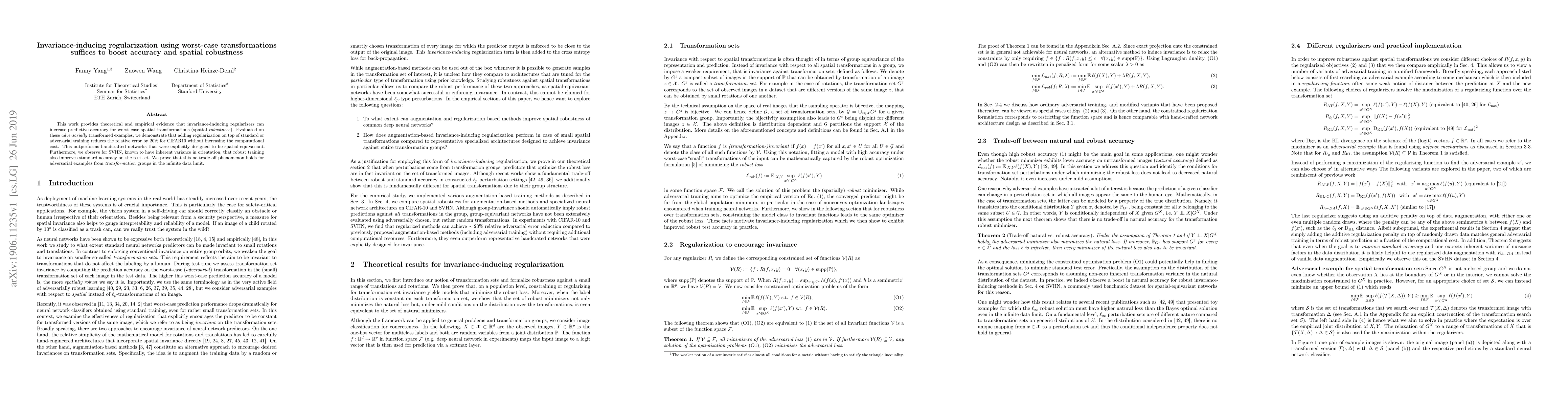 This work provides theoretical and empirical evidence that invariance-inducing regularizers can increase predictive accuracy for worst-case spatial transformations (spatial robustness). Evaluated on these adversarially transformed examples, we demonstrate that adding regularization on top of standard or adversarial training reduces the relative error by 20% for CIFAR10 without increasing the computational cost. This outperforms handcrafted networks that were explicitly designed to be spatial-equivariant. Furthermore, we observe for SVHN, known to have inherent variance in orientation, that robust training also improves standard accuracy on the test set. We prove that this no-trade-off phenomenon holds for adversarial examples from transformation groups in the infinite data limit.