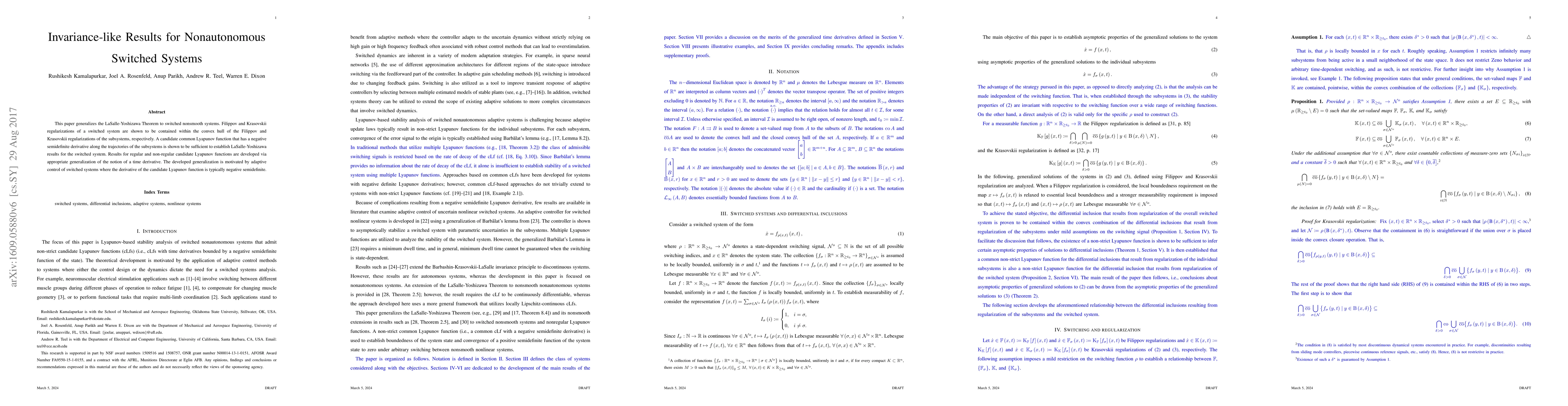 This paper generalizes the Lasalle-Yoshizawa Theorem to switched nonsmooth systems. Filippov and Krasovskii regularizations of a switched system are shown to be contained within the convex hull of the Filippov and Krasovskii regularizations of the subsystems, respectively. A candidate common Lyapunov function that has a negative semidefinite derivative along the trajectories of the subsystems is shown to be sufficient to establish LaSalle-Yoshizawa results for the switched system. Results for regular and non-regular candidate Lyapunov functions are presented using an appropriate generalization of the time derivative. The developed generalization is motivated by adaptive control of switched systems where the derivative of the candidate Lyapunov function is typically negative semidefinite.