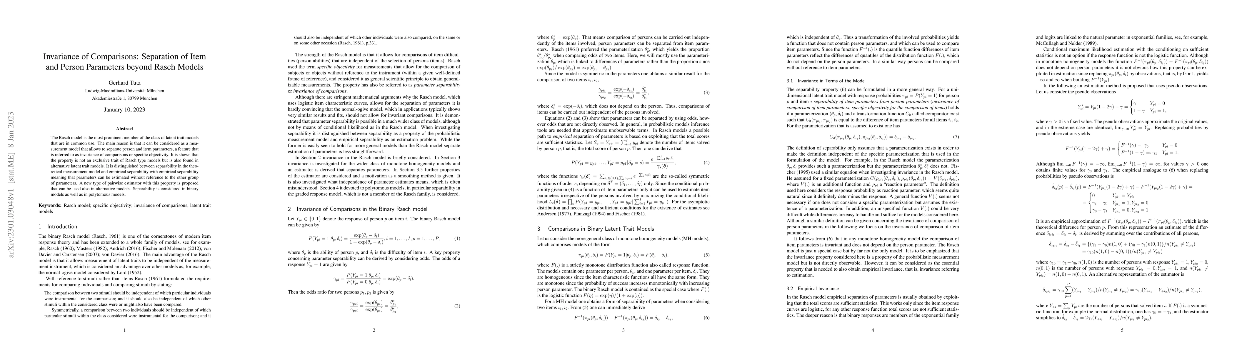 This paper demonstrates that the invariance of comparisons, which allows for the separation of person and item parameters, is not exclusive to Rasch models but is also present in other latent trait models. A new pairwise estimator is proposed to achieve this separability in both binary and polytomous models.